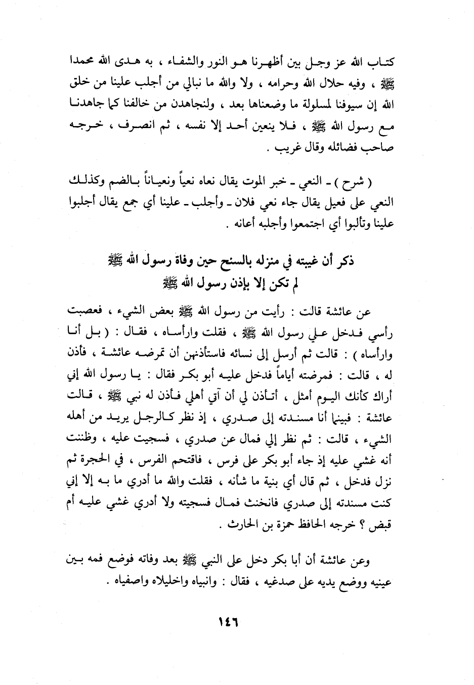 عن عائشة قالت: رأيت من رسول الله -صلى الله عليه وسلم- بعض الشيء, فعصبت رأسي فدخل علي رسول الله -صلى الله عليه وسلم- فقلت: وا رأساه فقال: "بل أنا وا رأساه" قالت: ثم أرسل إلى نسائه فاستأذنهن أن تمرضه عائشة, فأذنَّ له قالت: فمرضته أيامًا فدخل عليه أبو بكر فقال: يا رسول الله إني أراك كأنك اليوم أمثل, أتأذن لي أن آتي أهلي فأذن له نبي الله -صلى الله عليه وسلم- قالت عائشة: فبينما أنا مسندته إلى صدري, إذ نظر كالرجل يريد من أهله الشيء, قالت: ثم نظر إلي فمال عن صدري فسجيت عليه, وظننت أنه غشي عليه إذ جاء أبو بكر على فرس فاقتحم الفرس في الحجرة, ثم نزل فدخل ثم قال: أي بنية ما شأنه؟ فقلت: والله ما أدري ما به إلا أني كنت مسندته إلى صدري فانخنث, فمال فسجيته, ولا أدري غشي عليه أم قبض؟ خرجه الحافظ حمزة بن الحارث.