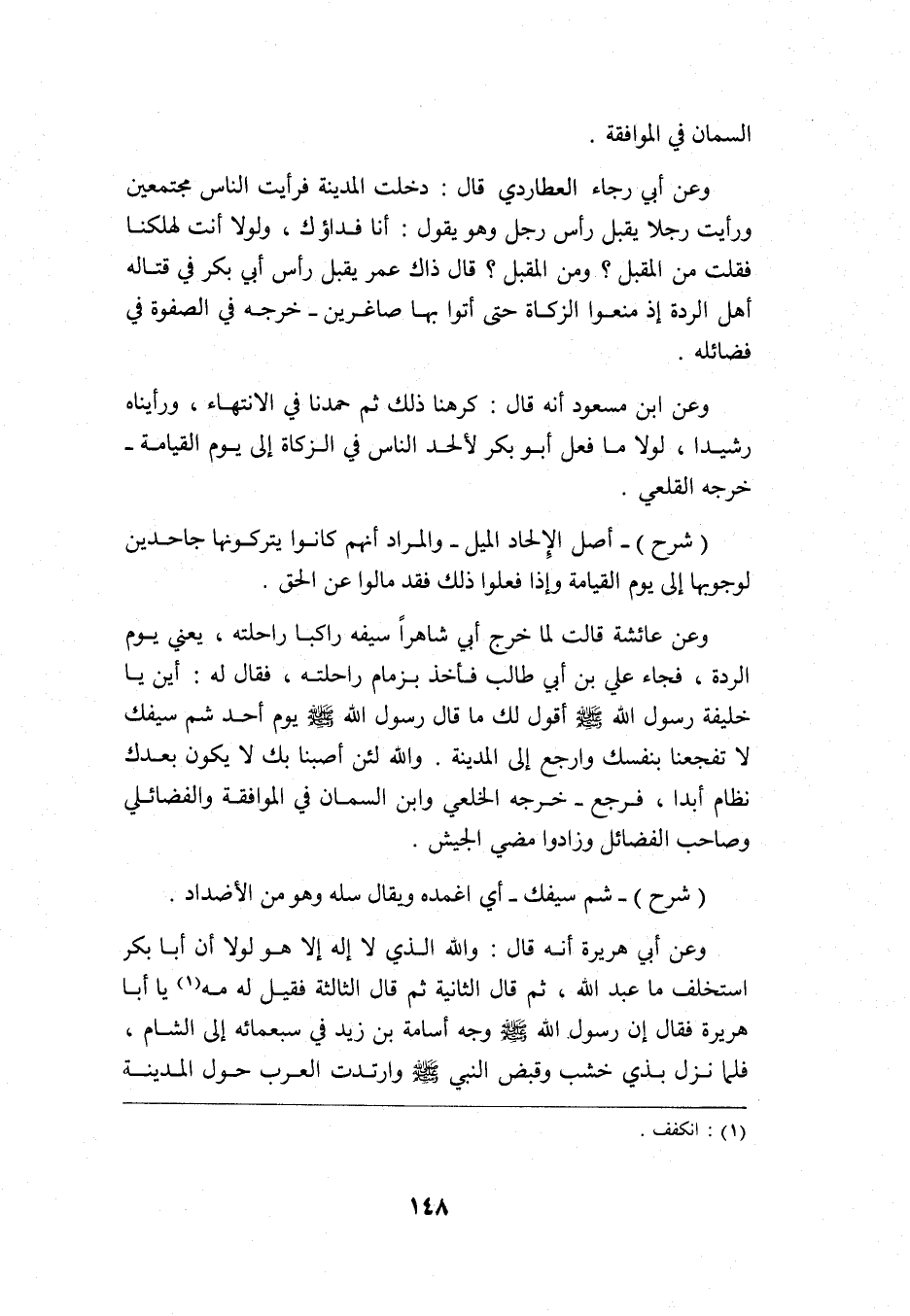 وعن أبي رجاء العطاردي قال: دخلت المدينة فرأيت الناس مجتمعين, ورأيت رجلًا يقبل رأس رجل وهو يقول: أنا فداؤك ولولا أنت لهلكنا, فقلت: من المقبِّل, ومن المقبَّل؟ قالوا: ذاك عمر يقبِّل رأس أبي بكر في قتاله أهل الردة, إذ منعوا الزكاة حتى أتوا بها صاغرين. خرجه في الصفوة وفي فضائله. وعن ابن مسعود أنه قال: كرهنا ذلك ثم حمدناه في الانتهاء, ورأيناه رشيدًا, ولولا ما فعل أبو بكر لألحد الناس في الزكاة إلى يوم القيامة, خرجه القلعي.