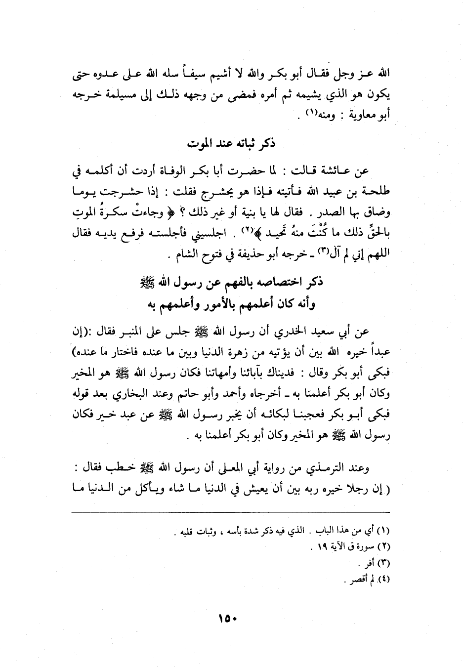 عن أبي سعيد الخدري أن رسول الله -صلى الله عليه وسلم- جلس على المنبر فقال: "إن عبدًا خيره الله بين أن يؤتيه من زهرة الدنيا وبين ما عنده, فاختار ما عنده" فبكى أبو بكر وقال: فديناك بآبائنا وأمهاتنا, فكان رسول الله -صلى الله عليه وسلم- هو المخير وكان أبو بكر أعلمنا به. أخرجاه وأحمد وأبو حاتم وعند البخاري بعد قوله فبكى أبو بكر: فعجبنا لبكائه أن يخبر رسول الله -صلى الله عليه وسلم- عن عبد خير, فكان رسول الله -صلى الله عليه وسلم- هو المخير وكان أبو بكر أعلمنا به.