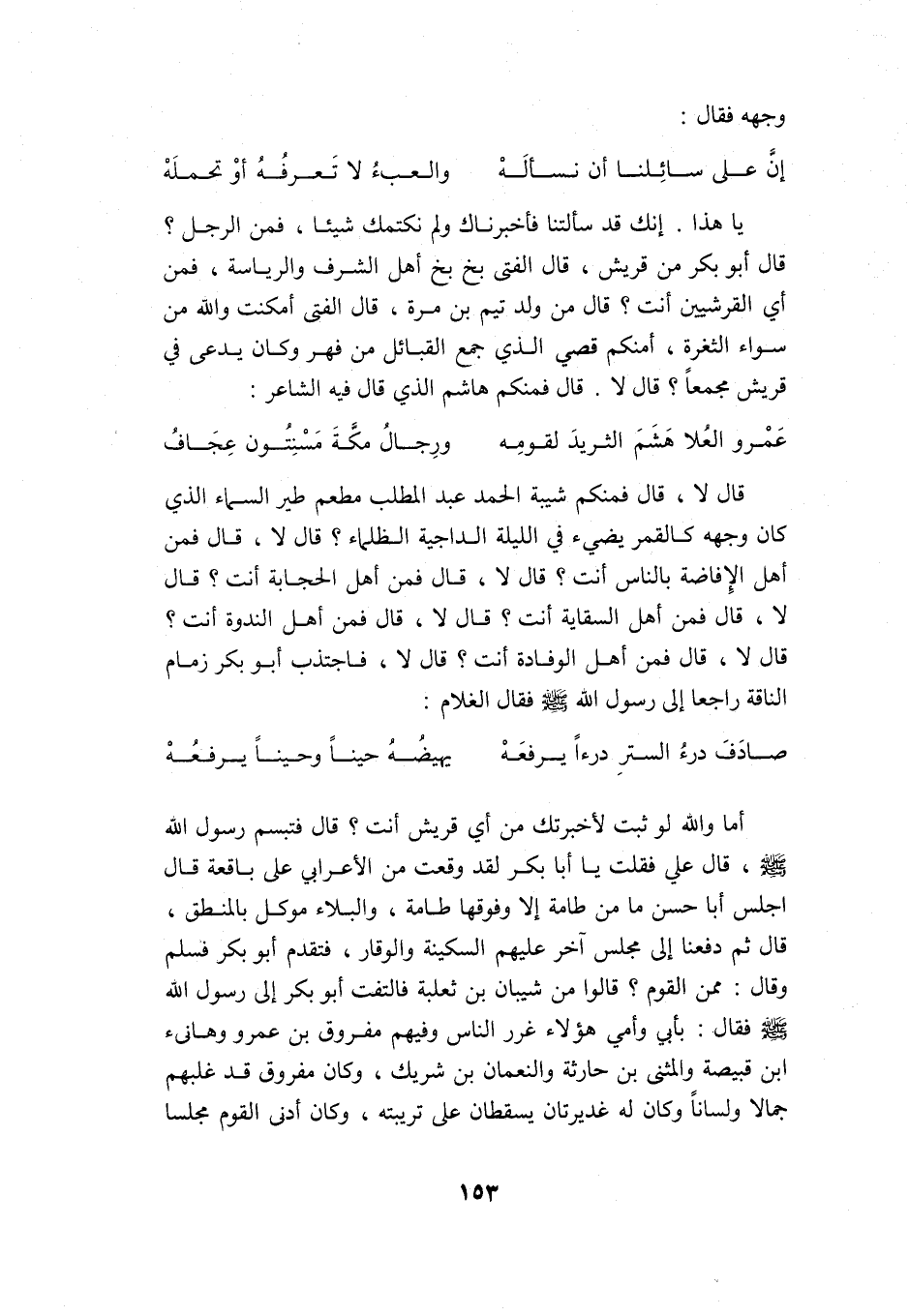 قال: لا, قال: فمنكم شيبة الحمد عبد المطلب مطعم طير السماء الذي كان وجهه كالقمر يضيء في الليلة الداجية الظلماء؟ قال: لا, قال: فمن أهل الإفاضة بالناس أنت؟ قال: لا قال: فمن أهل الحجابة أنت؟ قال: لا, قال: فمن أهل السقاية أنت؟ قال: لا, قال: فمن أهل الندوة أنت؟ قال: لا قال: فمن أهل الوفادة أنت؟ قال: لا, فاجتذب أبو بكر زمام الناقة راجعًا إلى رسول الله -صلى الله عليه وسلم- فقال الغلام: