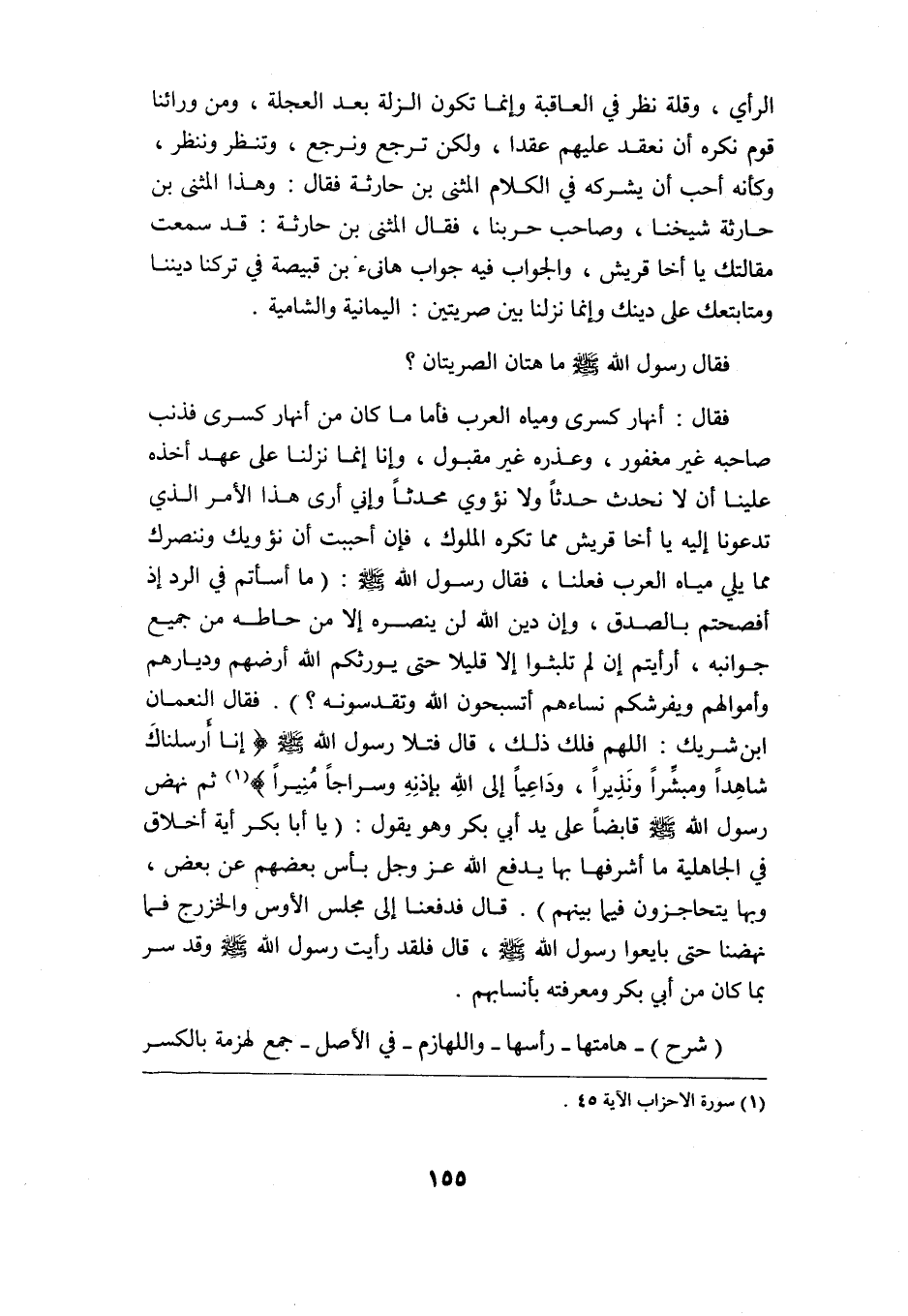 الرأي وقلة نظر في العاقبة وإنما تكون الزلة مع العجلة, ومن ورائنا قوم نكره أن نعقد عليهم عقدًا, ولكن ترجع ونرجع وتنظر وننظر, وكأنه أحب أن يشركه في الكلام المثنى بن حارثة فقال: وهذا المثنى بن حارثة شيخنا وصاحب حربنا, فقال المثنى بن حارثة: وقد سمعت مقالتك يا أخا قريش, والجواب فيه جواب هانئ بن قبيصة في تركنا ديننا ومتابعتك على دينك, وإنما نزلنا بين صريتين: اليمانية والشامية.