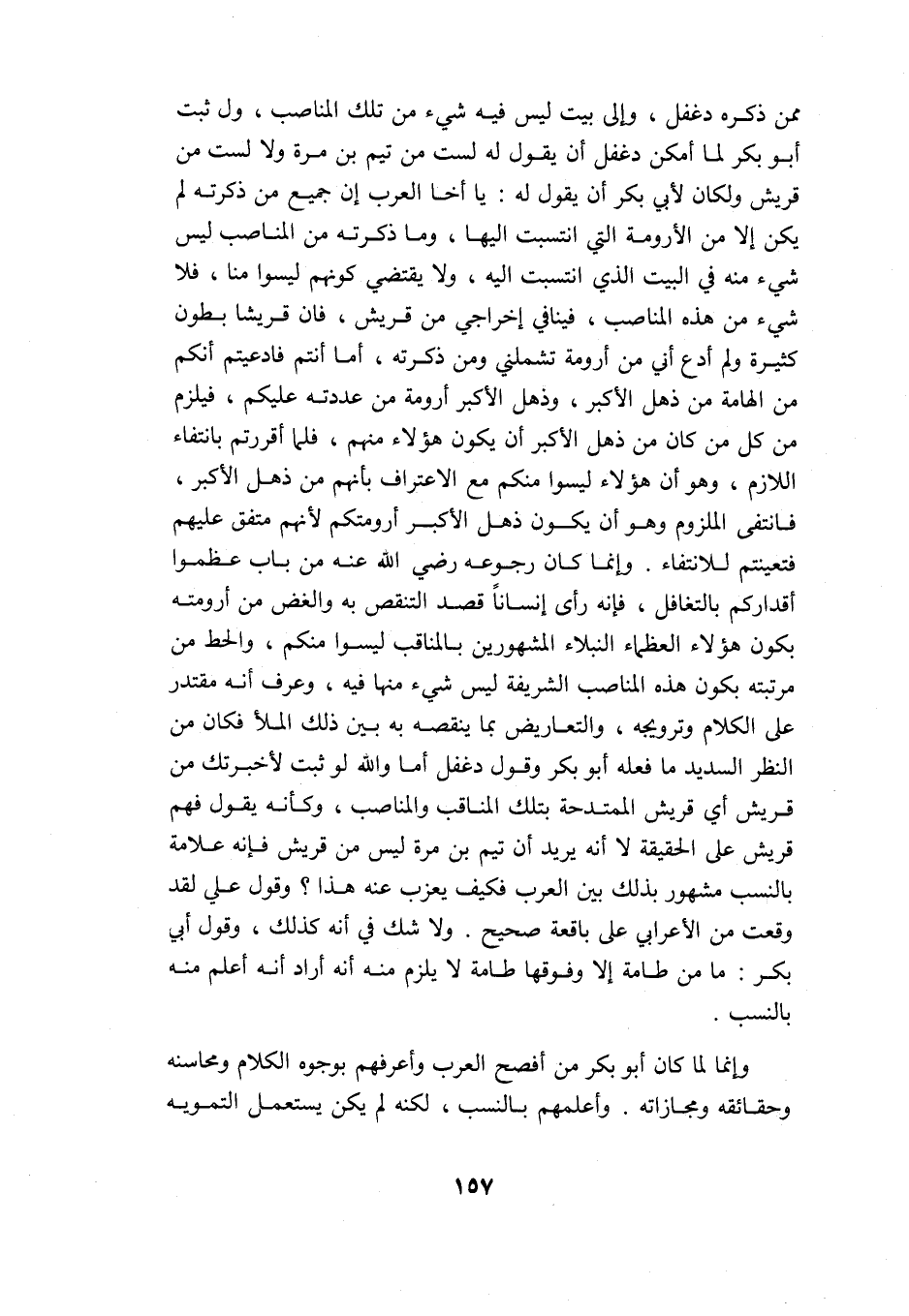 ممن ذكره دغفل, وإلى بيت ليس فيه شيء من تلك المناصب, ولو ثبت أبو بكر لما أمكن دغفل أن يقول له: لست من تيم بن مرة ولا لست من قريش, ولكان لأبي بكر أن يقول له: يا أخا العرب إن جميع من ذكرته لم يكن إلا من الأرومة التي انتسبت إليها, وما ذكرته من المناصب ليس شيء منه في البيت الذي انتسبت إليه, ولا يقتضي كونهم ليسوا منا, فلا شيء من هذه المناصب, فينافي إخراجي من قريش, فإن قريشًا بطون كثيرة ولم أدع أني من أرومة تشملني ومن ذكرته, أما أنتم فادعيتم أنكم من الهامة من ذهل الأكبر, وذهل الأكبر أرومة من عددته عليكم, فيلزم من كل من كان من ذهل الأكبر أن يكون هؤلاء منهم, فلما أقررتم بانتفاء اللازم وهو أن هؤلاء ليسوا منكم مع الاعتراف بأنهم من ذهل الأكبر, فانتفى الملزوم وهو أن يكون ذهل الأكبر أرومتكم؛ لأنهم متفق عليهم فتعينتم للانتفاء. وإنما كان رجوعه -رضي الله عنه- من باب عظموا أقداركم بالتغافل فإنه رأى إنسانًا قصد التنقص به والغض من أرومته بكون هؤلاء العظماء النبلاء المشهورين بالمناقب ليسوا منكم, والحط من مرتبته بكون هذه المناصب الشريفة ليس شيء منها فيه, وعرف أنه مقتدر على الكلام وترويجه, والتعاريض بما ينقصه به بين ذلك الملأ فكان من النظر السديد ما فعله أبو بكر, وقول دغفل: أما والله لو ثبت لأخبرتك من قريش أي قريش الممتدحة بتلك المناقب والمناصب, وكأنه يقول: فهم قريش على الحقيقة, لا أنه يريد أن تيم بن مرة ليس من قريش فإنه علّامة بالنسب مشهور بذلك بين العرب, فكيف يعزب عنه هذا؟ وقول علي: لقد وقعت من الأعرابي على باقعة صحيح, ولا شك في أنه كذلك, وقول أبي بكر: ما من طامة إلا وفوقها طامة لا يلزم منه أنه أراد أنه أعلم منه بالنسب.