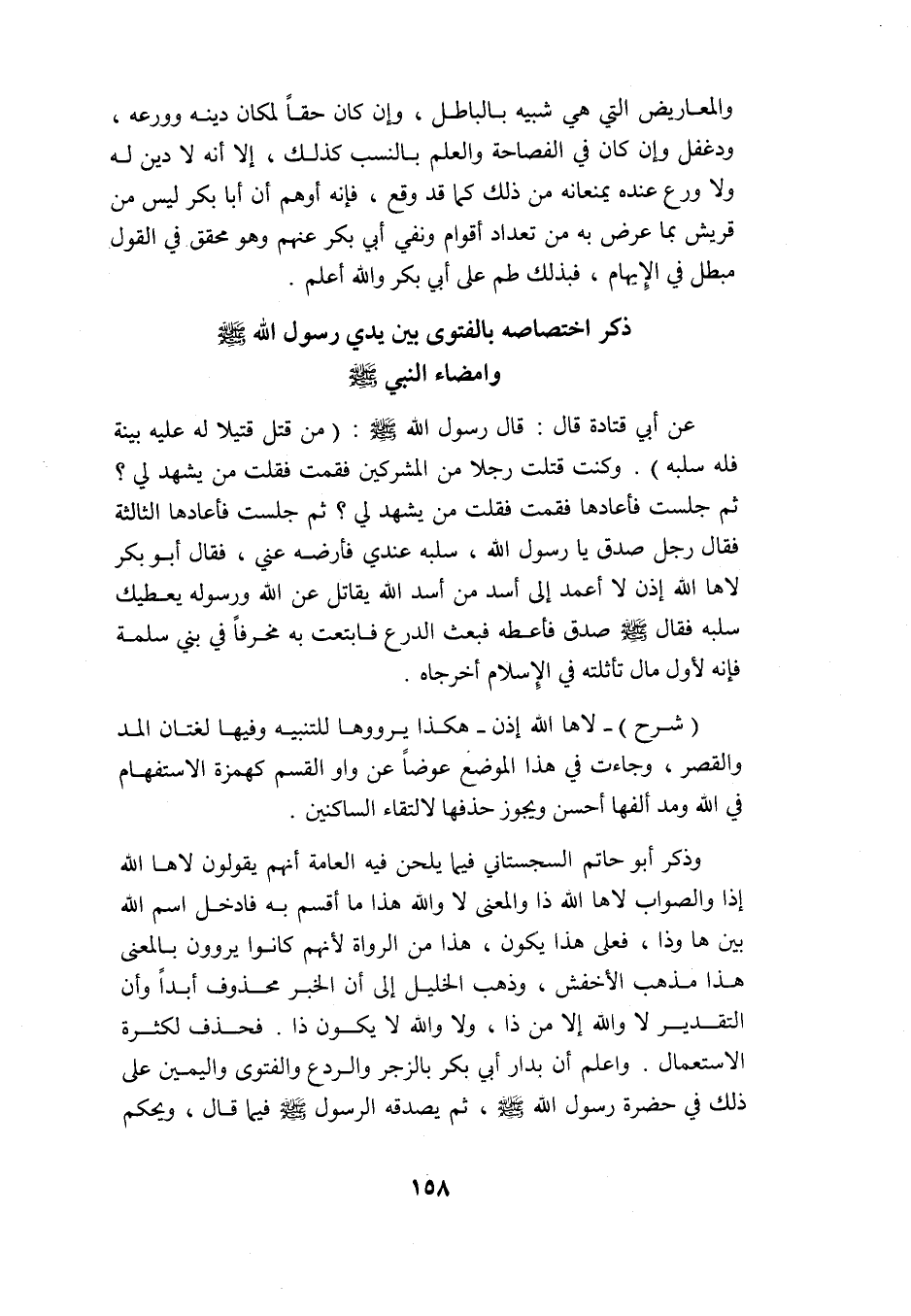 وذكر أبو حاتم السجستاني فيما يلحن فيه العامة أنهم يقولون: لا ها الله إذا, والصواب: لا ها الله ذا والمعنى: لا والله هذا ما أقسم به فأدخل اسم الله بين ها وذا, فعلى هذا يكون هذا من الرواة لأنهم كانوا يروون بالمعنى, هذا مذهب الأخفش, وذهب الخليل إلى أن الخبر محذوف أبدًا وأن التقدير: لا والله إلا من ذا, ولا والله لا يكون ذا, فحذف لكثرة الاستعمال. واعلم أن بدار أبي بكر بالزجر والردع والفتوى واليمين على ذلك في حضرة رسول الله -صلى الله عليه وسلم- ثم يصدقه الرسول -صلى الله عليه وسلم- فيما قال, ويحكم