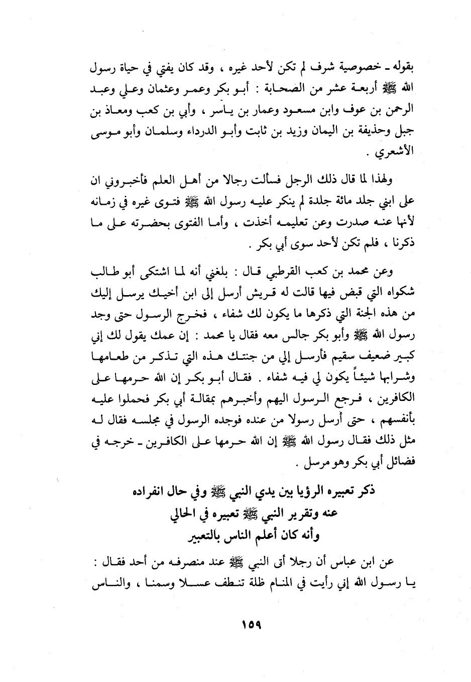 ذكر تعبيره الرؤيا بين يدي النبي -صلى الله عليه وسلم- وفي حال انفراده عنه, وتقرير النبي -صلى الله عليه وسلم- تعبيره في الحالي, وأنه كان أعلم الناس بالتعبير: