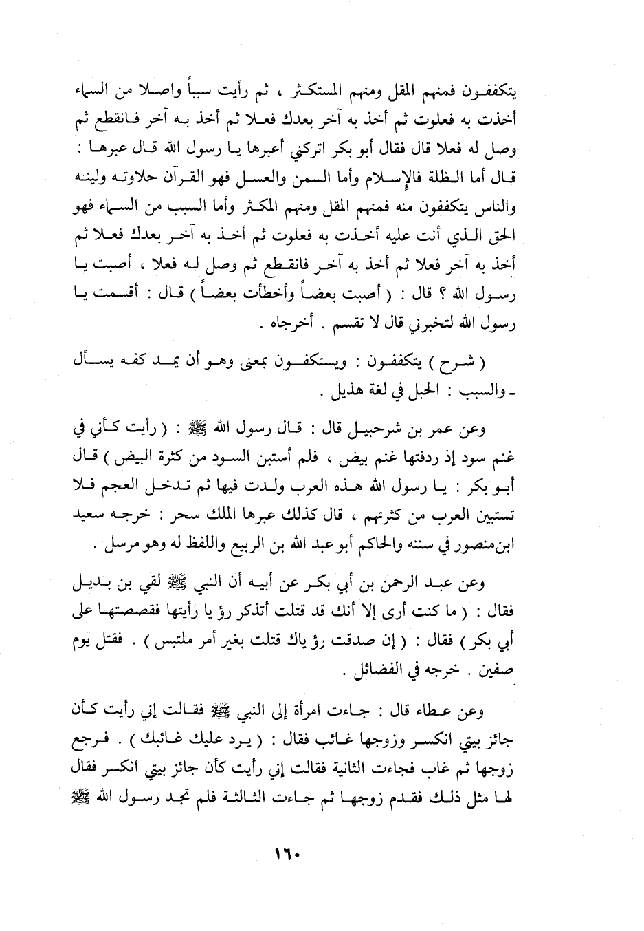 يتكففون فمنهم المقل ومنهم المستكثر, ثم رأيت سببًا واصلًا من السماء أخذت به فعلوت, ثم أخذ به آخر بعدك فعلا, ثم أخذ به آخر فانقطع, ثم وصل له فعلا قال: فقال أبو بكر: اتركني أعبرها يا رسول الله قال: "عبرها" قال: أما الظلة فالإسلام, وأما السمن والعسل فهو القرآن حلاوته ولينه, والناس يتكففون منه فمنهم المقل ومنهم المكثر, وأما السبب من السماء فهو الحق الذي أنت عليه أخذت به فعلوت ثم أخذ به آخر بعدك فعلا, ثم أخذ به آخر فعلا, ثم أخذ به آخر فانقطع, ثم وصل له فعلا, أصبت يا رسول الله؟ قال: "أصبت بعضًا, وأخطأت بعضًا" قال: أقسمت يا رسول الله لتخبرني قال: "لا تقسم" أخرجاه.
