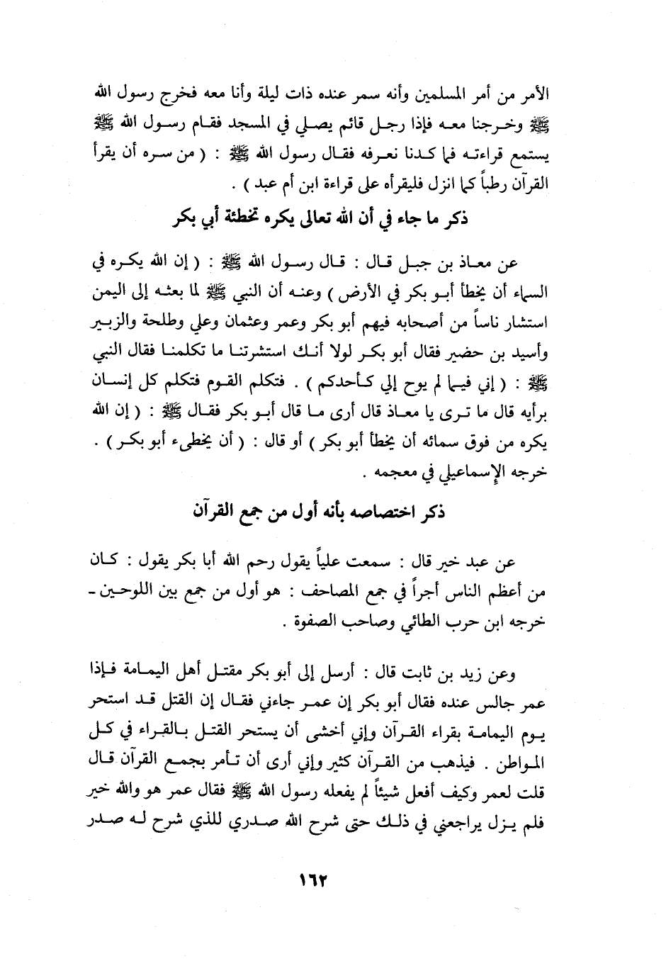 عن عبد خير قال: سمعت عليا يقول: رحم الله أبا بكر: كان من أعظم الناس أجرًا في جمع المصاحف, وهو أول من جمع بين اللوحين. خرجه ابن حرب الطائي وصاحب الصفوة.