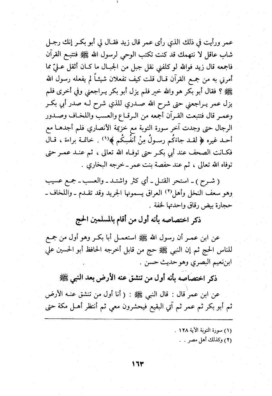 عمر, ورأيت في ذلك الذي رأى عمر قال زيد: فقال لي أبو بكر: إنك رجل شاب عاقل لا نتهمك, قد كنت تكتب الوحي لرسول الله -صلى الله عليه وسلم- فتتبع القرآن فاجمعه, قال زيد: فوالله لو كلفني نقل جبل من الجبال ما كان أثقل علي مما أمرني به من جمع القرآن, قال: قلت: كيف تفعلان شيئًا لم يفعله رسول الله -صلى الله عليه وسلم؟ فقال أبو بكر: هو والله خير, فلم يزل أبو بكر يراجعني وفي أخرى: فلم يزل عمر يراجعني, حتى شرح الله صدري للذي شرح له صدر أبي بكر وعمر, قال: فتتبعت القرآن أجمعه من الرقاع والعسب واللخاف وصدور الرجال, حتى وجدت آخر سورة التوبة مع خزيمة الأنصاري, فلم أجدها مع أحد غيره: {لَقَدْ جَاءَكُمْ رَسُولٌ مِنْ أَنْفُسِكُمْ} 1 خاتمة براءة, قال: فكانت الصحف عند أبي بكر حتى توفاه الله تعالى, ثم عند عمر حتى توفاه الله تعالى, ثم عند حفصة بنت عمر, خرجه البخاري.