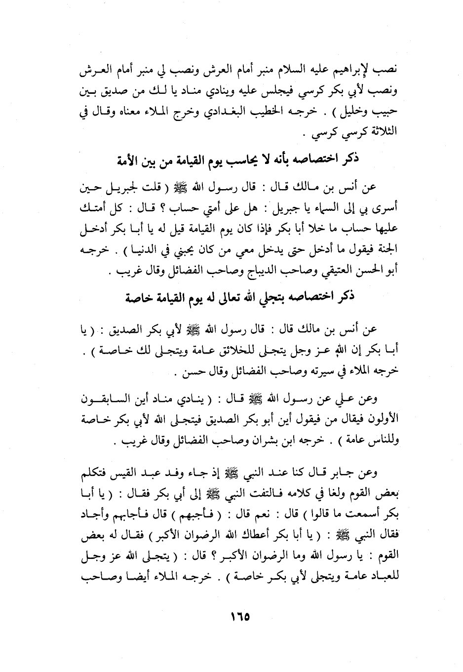 نصب لإبراهيم -عليه السلام- منبر أمام العرش, ونصب لي منبر أمام العرش, ونصب لأبي بكر كرسي فيجلس عليه وينادي منادٍ: يا لك من صديق بين حبيب وخليل" خرجه الخطيب البغدادي, وخرج الملاء معناه وقال في الثلاثة: كرسي كرسي.