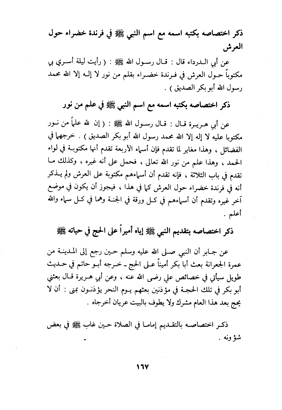 عن أبي الدرداء قال: قال رسول الله -صلى الله عليه وسلم: "رأيت ليلة أسري بي مكتوبًا حول العرش في فرندة خضراء بقلم من نور: لا إله إلا الله محمد رسول الله, أبو بكر الصديق".