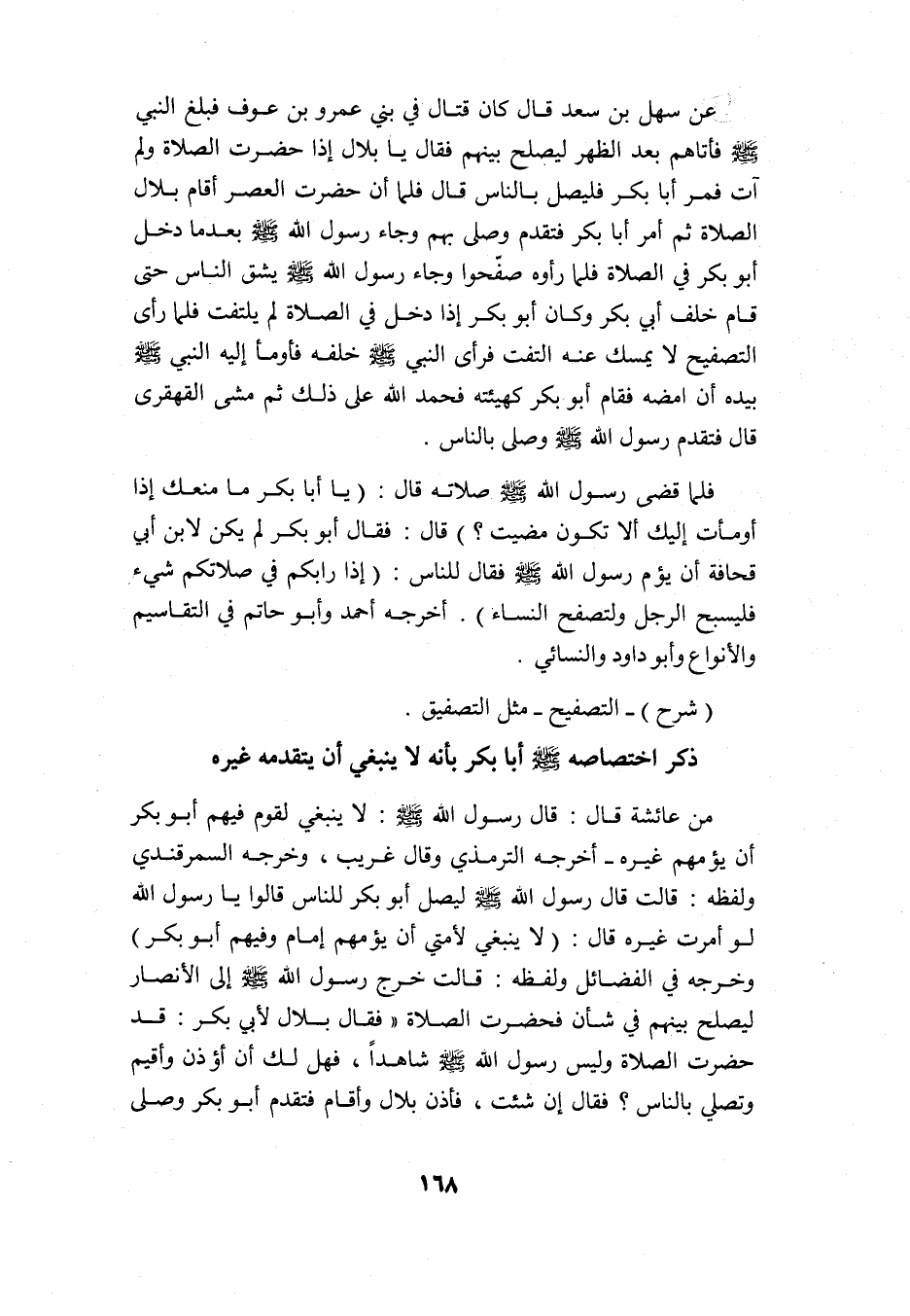 فلما قضى رسول الله -صلى الله عليه وسلم- صلاته قال: "يا أبا بكر, ما منعك إذ أومأت إليك ألا تكون مضيت؟ " قال: فقال أبو بكر: لم يكن لابن أبي قحافة أن يؤم رسول الله -صلى الله عليه وسلم- فقال للناس: "إذا رابكم في صلاتكم شيء, فليسبح الرجل ولتصفح النساء" أخرجه أحمد وأبو حاتم في التقاسيم والأنواع, وأبو داود والنسائي.