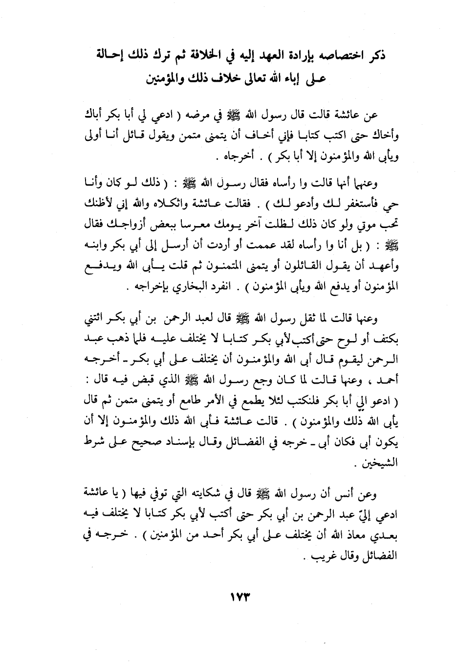 وعن أنس أن رسول الله -صلى الله عليه وسلم- قال في شكايته التي توفي فيها: "يا عائشة, ادعي إلي عبد الرحمن بن أبي بكر حتى أكتب لأبي بكر كتابًا لا يختلف فيه بعدي, معاذ الله أن يختلف على أبي بكر أحد من المؤمنين" خرجه في الفضائل وقال: غريب.