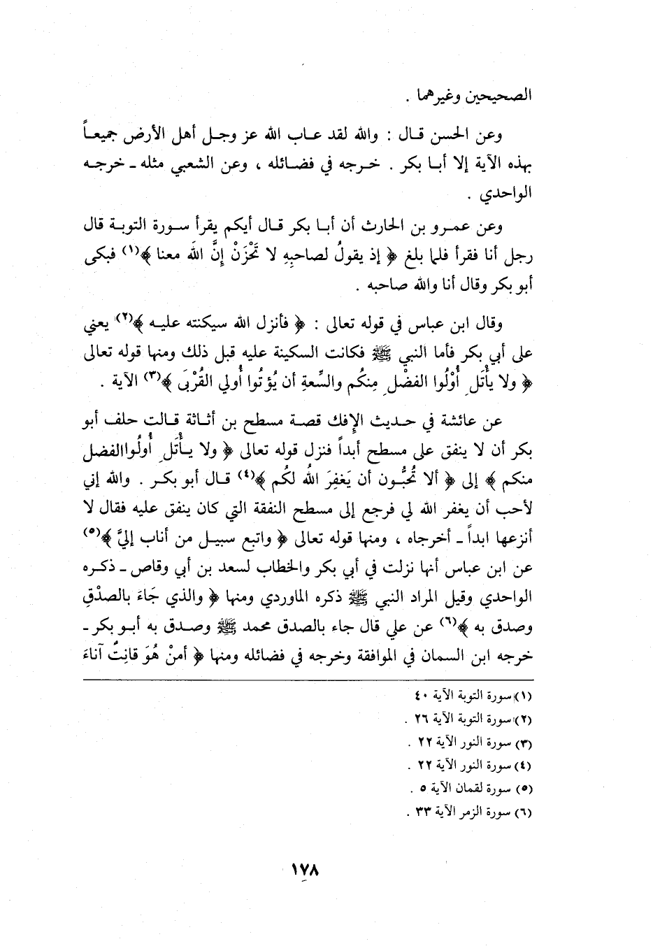 وعن عائشة في حديث الإفك قصة مسطح بن أثاثة قالت: حلف أبو بكر أن لا ينفق على مسطح أبدًا, فنزل قوله تعالى: {وَلا يَأْتَلِ أُولُو الْفَضْلِ مِنْكُمْ} إلى {أَلا تُحِبُّونَ أَنْ يَغْفِرَ اللَّهُ لَكُمْ} 4 قال أبو بكر: والله إني لأحب أن يغفر الله لي, فأرجع إلى مسطح النفقة التي كان ينفق عليه فقال: لا أنزعها أبدًا أخرجاه, ومنها قوله تعالى: {وَاتَّبِعْ سَبِيلَ مَنْ أَنَابَ إِلَيَّ} 5 عن ابن عباس: أنها نزلت في أبي بكر والخطاب لسعد بن أبي وقاص, ذكره الواحدي وقيل: المراد النبي -صلى الله عليه وسلم- ذكره الماوردي, ومنها {وَالَّذِي جَاءَ بِالصِّدْقِ وَصَدَّقَ بِهِ} 6 عن علي قال: جاء بالصدق محمد -صلى الله عليه وسلم- وصدق به أبو بكر, خرجه ابن السمان في الموافقة وخرجه في فضائله, ومنها {أَمَّنْ هُوَ قَانِتٌ آنَاءَ