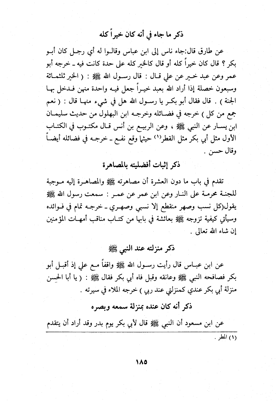 عن طارق قال: جاء ناس إلى ابن عباس فقالوا له: أي رجل كان أبو بكر؟ قال: كان خيرًا كله أو قال: كالخير كله على حدة كانت فيه, خرجه أبو عمر. وعن عبد خير عن علي قال: قال رسول الله -صلى الله عليه وسلم: "الخير ثلاثمائة وسبعون خصلة, إذا أراد الله بعبد خيرًا جعل فيه واحدة منهن, فدخل بها الجنة" قال: فقال أبو بكر: يا رسول الله هل فيَّ شيء منها؟ قال: "نعم, جمع من كل" خرجه في فضائله وخرجه ابن البهلول من حديث سليمان بن يسار عن النبي -صلى الله عليه وسلم, وعن الربيع بن أنس قال: مكتوب في الكتاب الأول: مثل أبي بكر مثل القطر1 حيثما وقع نفع. خرجه في فضائله أيضًا وقال: حسن.