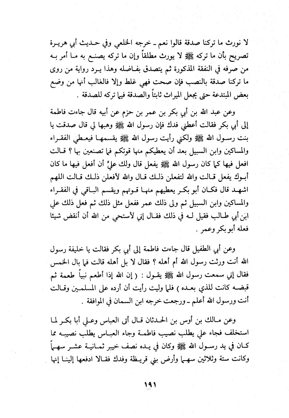 وعن مالك بن أوس بن الحدثان قال: أتى العباس وعلي أبا بكر لما استخلف, فجاء علي يطلب نصيب فاطمة وجاء العباس يطلب نصيبه مما كان في يد رسول الله -صلى الله عليه وسلم- وكان في يده نصف خيبر ثمانية عشر سهمًا وكانت ستة وثلاثين سهمًا وأرض بني قريظة وفدك فقالا: ادفعها إلينا إنها