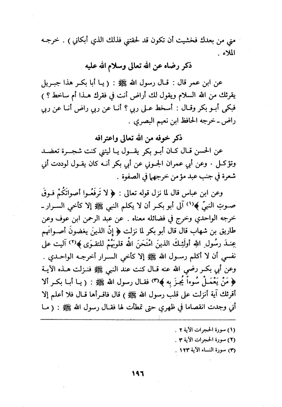 عن ابن عمر قال: قال رسول الله -صلى الله عليه وسلم: "يا أبا بكر هذا جبريل يقرئك من الله السلام ويقول لك: أراض أنت في فقرك هذا أم ساخط" فبكى أبو بكر وقال: أسخط على ربي؟! أنا عن ربي راض أنا عن ربي راض, خرجه الحافظ ابن نعيم البصري.