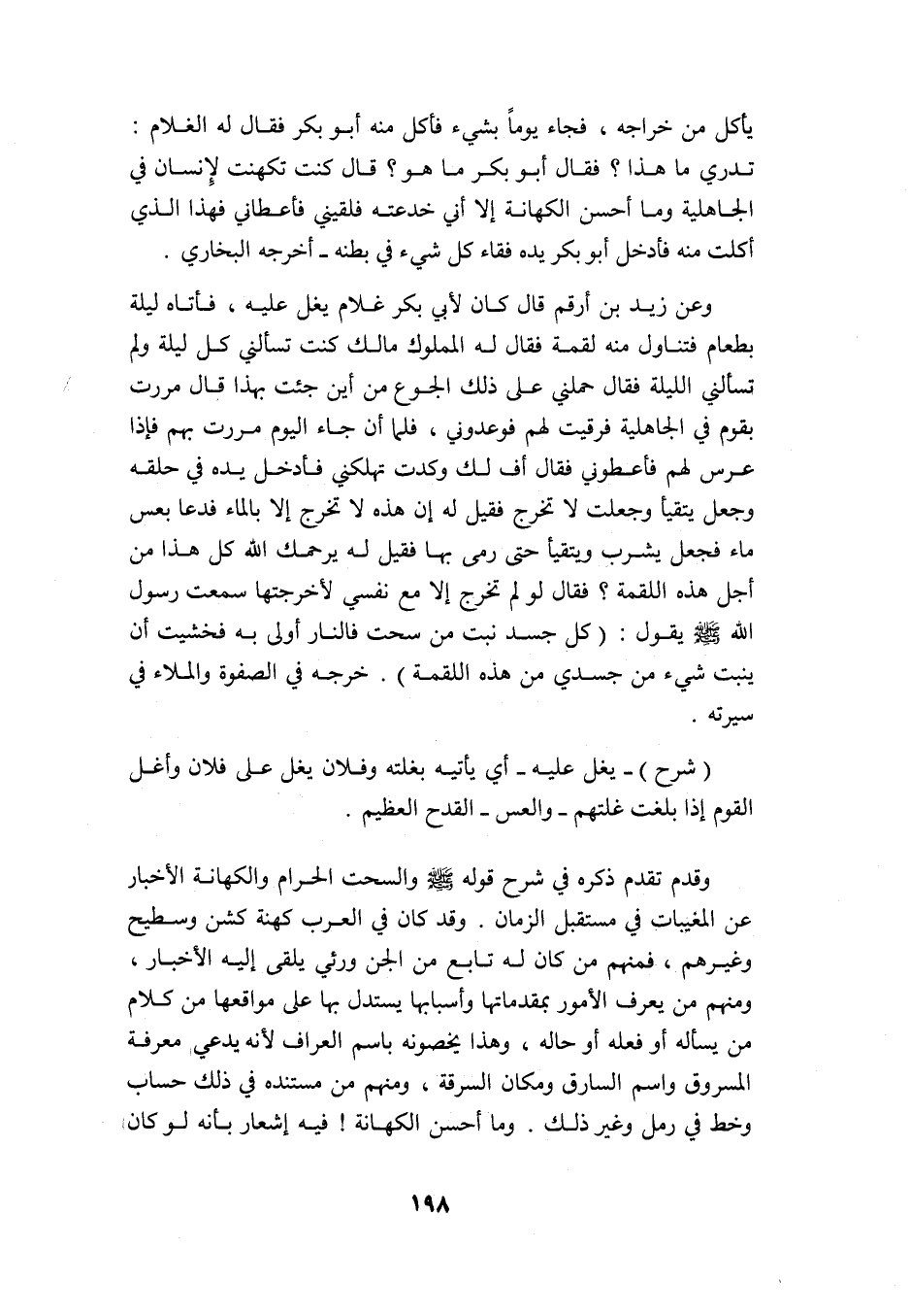 يأكل من خراجه, فجاء يومًا بشيء فأكل منه أبو بكر فقال له الغلام: تدري ما هذا؟ فقال أبو بكر: ما هو؟ قال: كنت تكهنت لإنسان في الجاهلية وما أحسن الكهانة, إلا أني خدعته فلقيني فأعطاني, فهذا الذي أكلت منه, فأدخل أبو بكر يده فقاء كل شيء في بطنه, أخرجه البخاري.