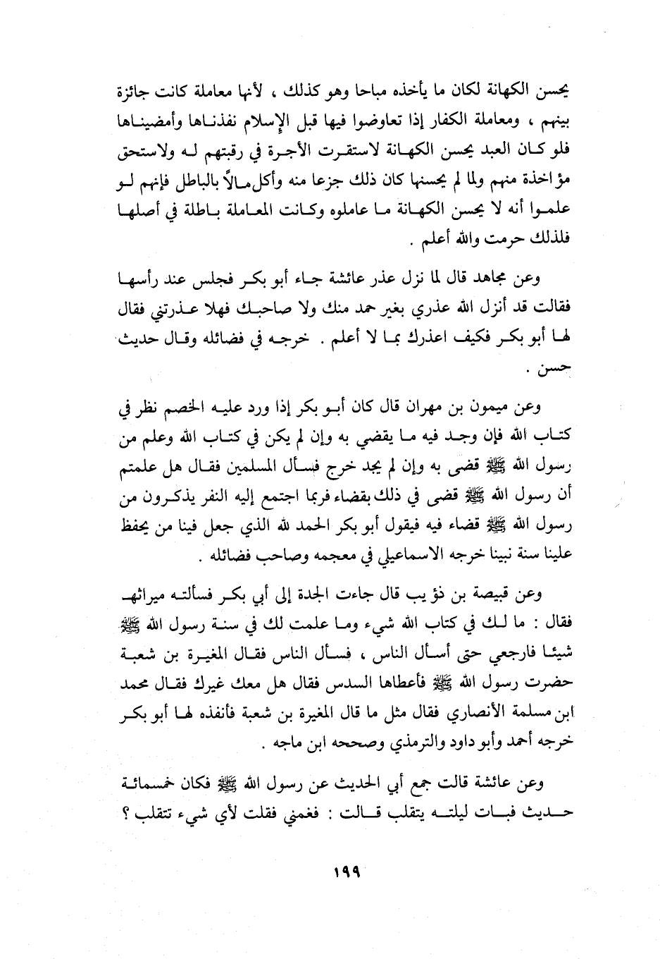 وعن قبيصة بن ذؤيب قال: جاءت الجدة إلى أبي بكر فسألته ميراثها فقال: ما لك في كتاب الله شيء وما علمت لك في سنة رسول الله -صلى الله عليه وسلم- شيئًا فارجعي حتى أسأل الناس, فسأل الناس فقال المغيرة بن شعبة: حضرت رسول الله -صلى الله عليه وسلم- فأعطاها السدس فقال: هل معك غيرك؟ فقام محمد بن مسلمة الأنصاري فقال مثل ما قال المغيرة بن شعبة, فأنفذه لها أبو بكر. خرجه أحمد وأبو داود والترمذي وصححه ابن ماجه.
