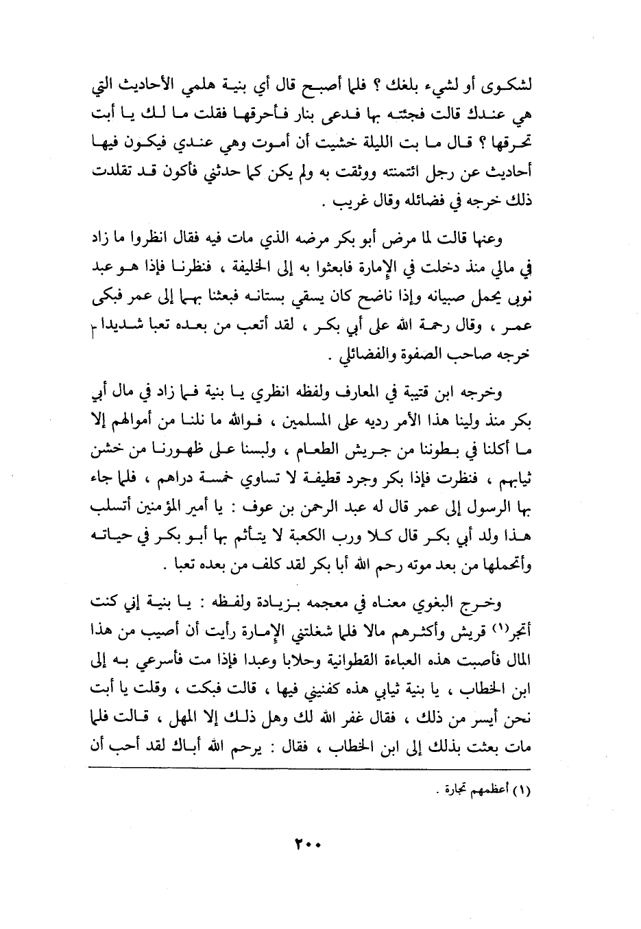 وخرجه ابن قتيبة في المعارف ولفظه: انظري يا بنية فما زاد في مال أبي بكر منذ ولينا هذا الأمر رديه على المسلمين, فوالله ما نلنا من أموالهم إلا ما أكلنا في بطوننا من جريش الطعام, ولبسنا على ظهورنا من خشن ثيابهم, فنظرت فإذا بكر وجرد قطيفة لا تساوي خمسة دراهم, فلما جاء بها الرسول إلى عمر قال له عبد الرحمن بن عوف: يا أمير المؤمنين أتسلب هذا ولد أبي بكر قال: كلا ورب الكعبة لا يتأثم بها أبو بكر في حياته وأتحملها بعد موته, رحم الله أبا بكر لقد كلف من بعده تعبًا.