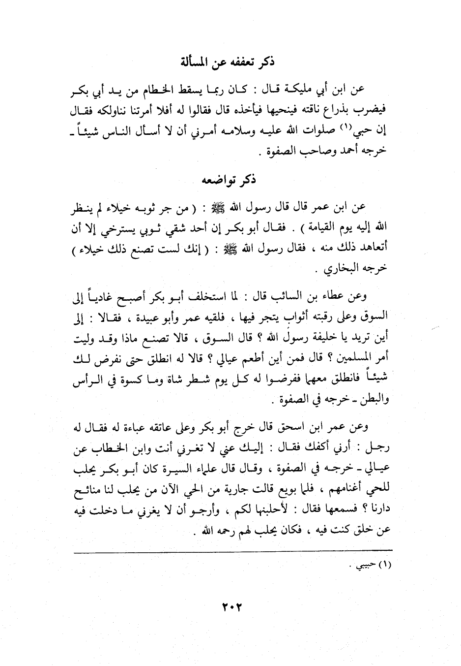 عن ابن أبي مليكة قال: كان ربما يسقط الخطام من يد أبي بكر فيضرب بذراع ناقته فينحيها فيأخذه قال: فقالوا له: أفلا أمرتنا نناولكه؟ فقال: إن حبي1 صلوات الله عليه وسلامه أمرني أن لا أسأل الناس شيئًا, خرجه أحمد وصاحب الصفوة.