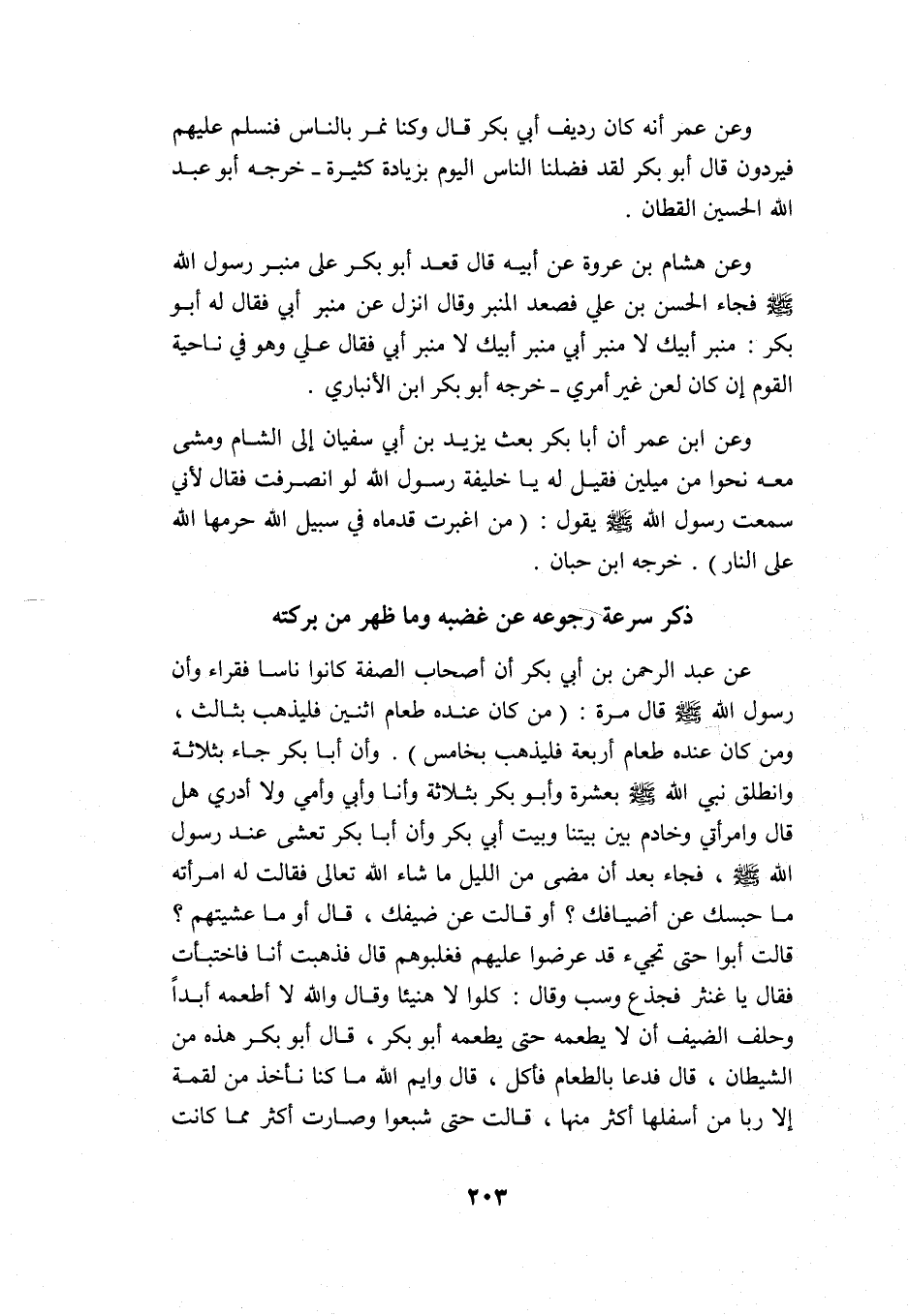 وعن هشام بن عروة عن أبيه قال: قعد أبو بكر على منبر رسول الله -صلى الله عليه وسلم- فجاء الحسن بن علي فصعد المنبر وقال: انزل عن منبر أبي فقال له أبو بكر: منبر أبيك لا منبر أبي, منبر أبيك لا منبر أبي فقال علي وهو في ناحية القوم: إن كان لعن غير أمري, خرجه أبو بكر بن الأنباري.