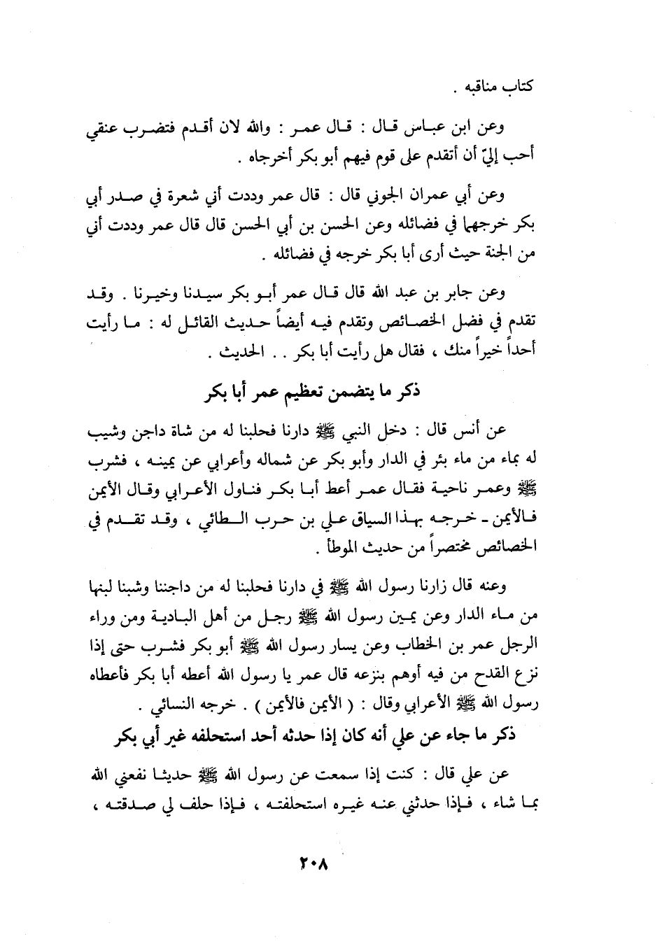 عن أنس قال: دخل النبي -صلى الله عليه وسلم- دارنا فحلبنا له من شاة داجن وشيب له بماء من ماء بئر في الدار وأبو بكر عن شماله وأعرابي عن يمينه, فشرب رسول الله -صلى الله عليه وسلم- وعمر ناحية فقال عمر: أعط أبا بكر, فناول الأعرابي وقال: "الأيمن فالأيمن" خرجه بهذا السياق علي بن حرب الطائي وقد تقدم في الخصائص مختصرًا من حديث الموطأ.