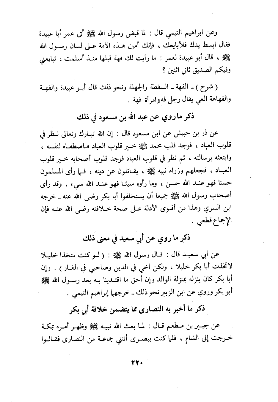 عن زر بن حبيش عن ابن مسعود قال: إن الله تبارك وتعالى نظر في قلوب العباد, فوجد قلب محمد -صلى الله عليه وسلم- خير قلوب العباد فاصطفاه لنفسه وابتعثه برسالته, ثم نظر في قلوب العباد فوجد قلوب أصحابه خير قلوب العباد فجعلهم وزراء نبيه -صلى الله عليه وسلم- يقاتلون عن دينه, فما رأى المسلمون حسنًا فهو عند الله حسن وما رأوه سيئًا فهو عند الله سيئًا, وقد رأى أصحاب رسول الله -صلى الله عليه وسلم- جميعًا أن يستخلفوا أبا بكر -رضي الله عنه. خرجه ابن السري وهذا من أقوى الأدلة على صحة خلافته -رضي الله عنه- فإن الإجماع قطعي.