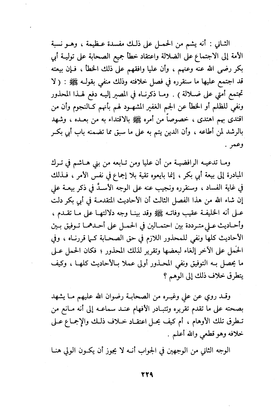 الثاني: أنه يشم من الحمل على ذلك مفسدة عظيمة, وهي نسبة الأمة إلى الاجتماع على الضلالة, واعتقاد خطأ جميع الصحابة على تولية أبي بكر -رضي الله عنه وعنهم أجمعين- وأن عليا وافقهم على ذلك الخطأ, فإن بيعته قد اجتمع عليها ما سنقرره في فصل خلافته وذلك منفي بقوله -صلى الله عليه وسلم: "لا تجتمع أمتي على ضلالة" وما ذكرناه في المصير إليه دفع لهذا المحذور ونفي للظلم أو الخطأ عن الجم الغفير المشهود لهم بأنهم كالنجوم وأن من اقتدى بهم اهتدى, خصوصًا من أمره -صلى الله عليه وسلم- بالاقتداء به من بعده, وشهد بالرشد لمن أطاعه, وأن الدين يتم به على ما سبق مما تضمنه باب أبي بكر وعمر.