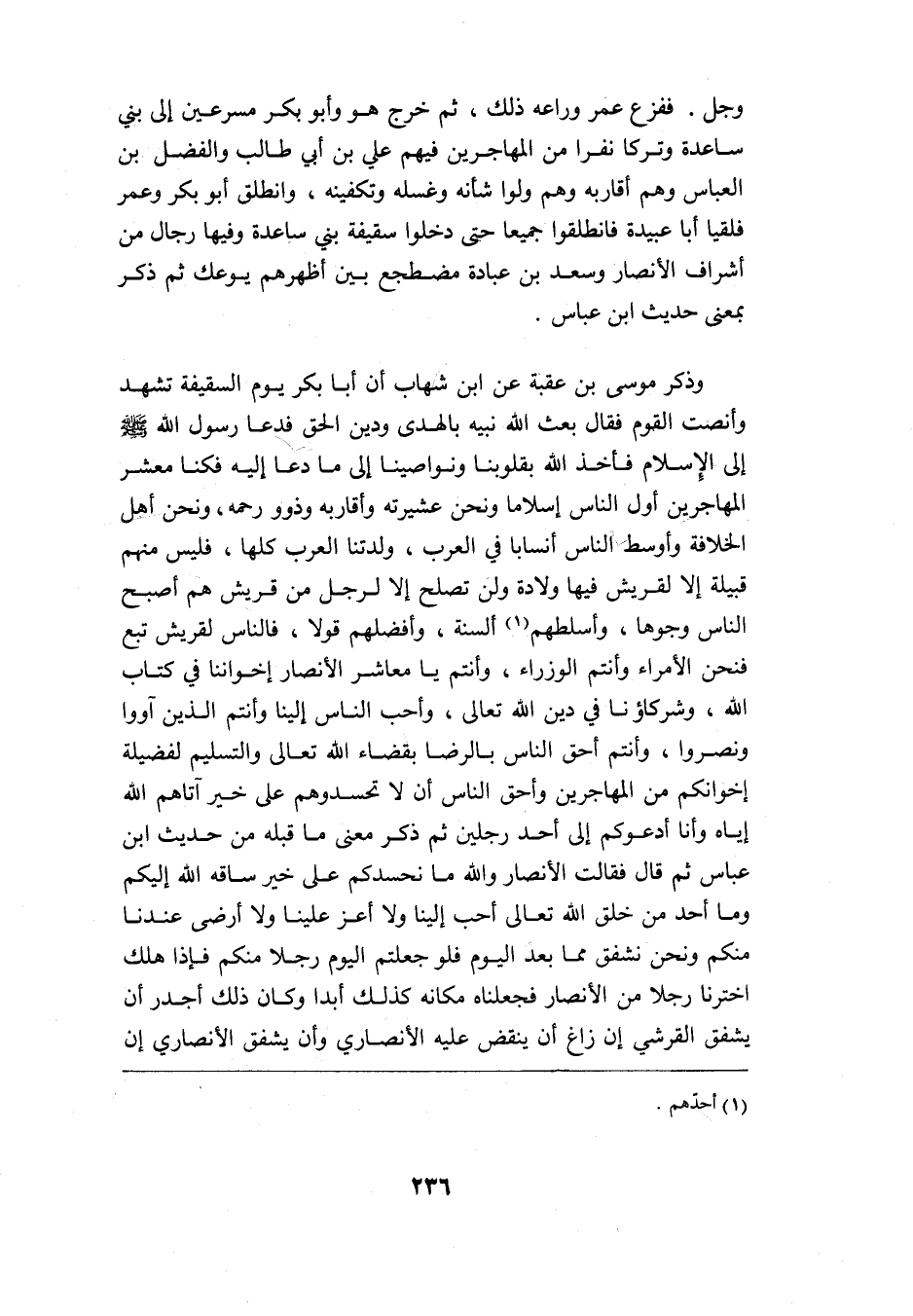 وذكر موسى بن عقبة عن ابن شهاب أن أبا بكر يوم السقيفة تشهد وأنصت القوم فقال: بعث الله نبيه بالهدى ودين الحق فدعا رسول الله -صلى الله عليه وسلم- إلى الإسلام فأخذ الله بقلوبنا ونواصينا إلى ما دعا إليه, فكنا معشر المهاجرين أول الناس إسلامًا ونحن عشيرته وأقاربه وذوو رحمه, ونحن أهل الخلافة وأوسط الناس أنسابًا في العرب, ولدتنا العرب كلها, فليس منهم قبيلة إلا لقريش فيها ولادة ولن تصلح إلا لرجل من قريش, هم أصبح الناس وجوها، وأسلطهم1 ألسنة وأفضلهم قولًا, فالناس لقريش تبع, فنحن الأمراء وأنتم الوزراء, وأنتم يا معاشر الأنصار إخواننا في كتاب الله وشركاؤنا في دين الله تعالى, وأحب الناس إلينا وأنتم الذين آووا ونصروا وأنتم أحق الناس بالرضا بقضاء الله تعالى والتسليم لفضيلة إخوانكم من المهاجرين, وأحق الناس أن لا تحسدوهم على خير آتاهم الله إياه وأنا أدعوكم إلى أحد رجلين, ثم ذكر معنى ما قبله من حديث ابن عباس ثم قال: فقالت الأنصار: والله ما نحسدكم على خير ساقه الله إليكم وما أحد من خلق الله تعالى أحب إلينا ولا أعز علينا ولا أرضى عندنا منكم, ونحن نشفق مما بعد اليوم فلو جعلتم اليوم رجلًا منكم فإذا هلك اخترنا رجلًا من الأنصار فجعلناه مكانه كذلك أبدًا, وكان ذلك أجدر أن يشفق القرشي إن زاغ أن ينقض عليه الأنصاري وأن يشفق الأنصاري إن