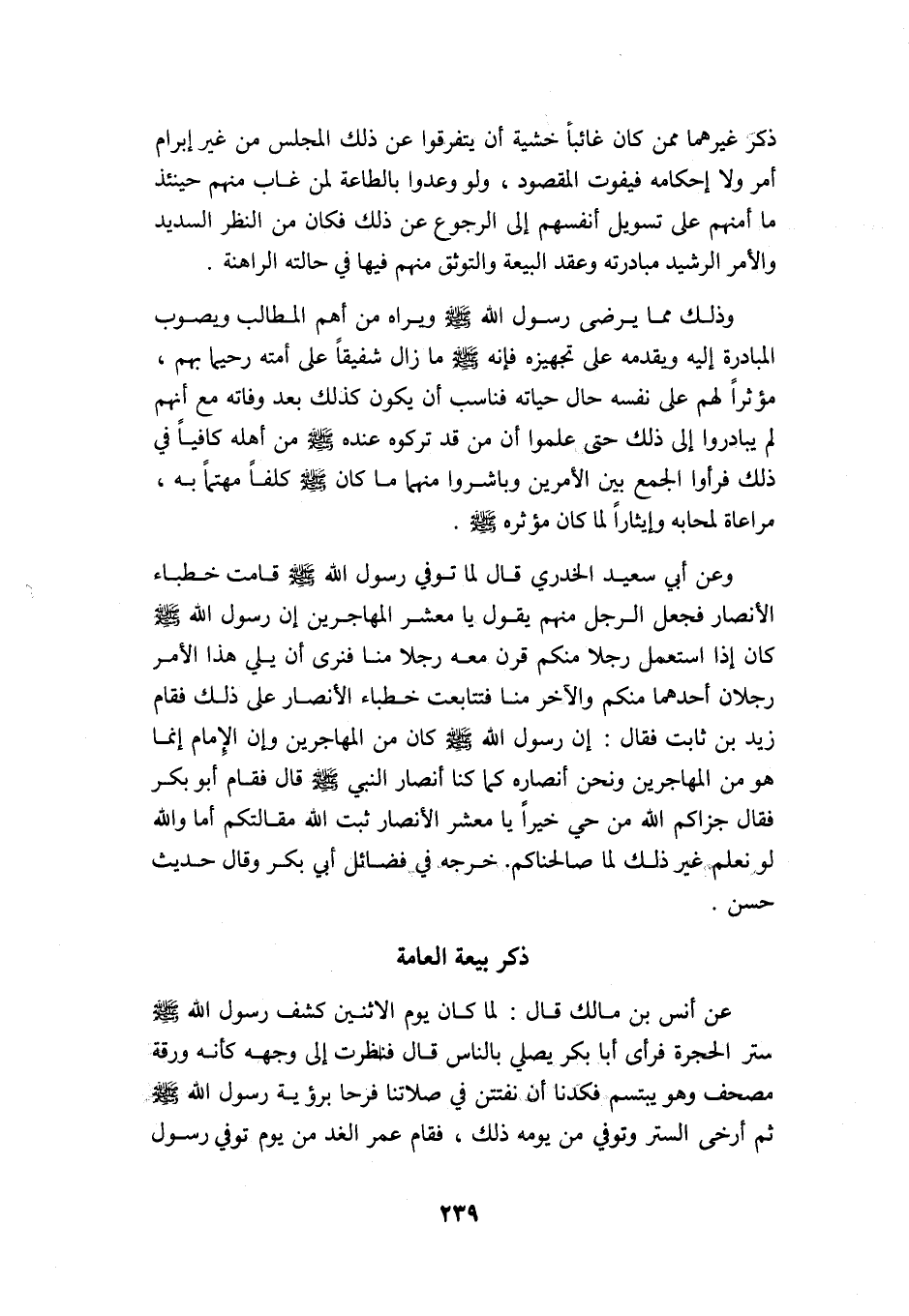 وعن أبي سعيد الخدري قال: لما توفي رسول الله -صلى الله عليه وسلم- قامت خطباء الأنصار فجعل الرجل منهم يقول: يا معشر المهاجرين إن رسول الله -صلى الله عليه وسلم- كان إذا استعمل رجلًا منكم قرن معه رجلًا منا, فنرى أن يلي هذا الأمر رجلان, أحدهما منكم والآخر منا, فتتابعت خطباء الأنصار على ذلك فقام زيد بن ثابت فقال: إن رسول الله -صلى الله عليه وسلم- كان من المهاجرين وإن الإمام إنما هو من المهاجرين ونحن أنصاره كما كنا أنصار النبي -صلى الله عليه وسلم- قال: فقام أبو بكر الصديق فقال: جزاكم الله من حي خيرًا يا معشر الأنصار, ثبت الله مقالتكم, أما والله لو نعلم غير ذلك لما صالحناكم. خرجه في فضائل أبي بكر وقال: حديث حسن.
