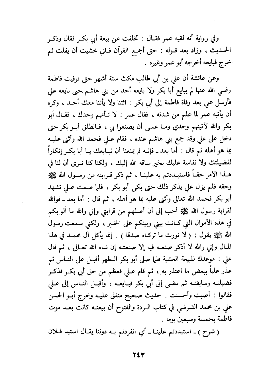 وعن عائشة -رضي الله عنها- أن علي بن أبي طالب -رضي الله عنه- مكث ستة أشهر حتى توفيت فاطمة -رضي الله عنها- لم يبايع أبا بكر ولم يبايعه أحد من بني هاشم حتى بايعه علي, فأرسل علي بعد وفاة فاطمة إلى أبي بكر: ائتنا ولا يأتنا معك أحد, وكره أن يأتيه عمر لما علم من شدته فقال عمر: لا تأتهم وحدك فقال أبو بكر: والله لآتينهم وحدي وما عسى أن يصنعوا بي, فانطلق أبو بكر حتى دخل على علي وقد جمع بني هاشم عنده, فقام علي فحمد الله وأثنى عليه بما هو أهله ثم قال: أما بعد, فإنه لم يمنعنا أن نبايعك يا أبا بكر إنكار لفضيلتك ولا نفاسة عليك بخير ساقه الله إليك, ولكنا كنا نرى أن لنا في هذا الأمر حقا فاستبددتم به علينا, ثم ذكر قرابته من رسول الله -صلى الله عليه وسلم- فلم يزل علي يذكر ذلك حتى بكى أبو بكر, فلما صمت علي تشهد أبو بكر فحمد الله تعالى وأثنى عليه بما هو أهله ثم قال: أما بعد, فوالله لقرابة رسول الله -صلى الله عليه وسلم- أحب إلى أن أصلهم من قرابتي, وإني والله ما آلو بكم في هذه الأموال التي كانت بيني وبينكم إلا الخير, ولكني سمعت رسول الله -صلى الله عليه وسلم- يقول: "لا نورث, ما تركناه صدقة" إنما يأكل آل محمد في هذا المال وإني والله لا أذكر صنعه فيه إلا صنعته إن شاء الله تعالى ثم قال علي: موعدك العشية للبيعة, فلما صلى أبو بكر الظهر أقبل على الناس ثم عذر عليا ببعض ما اعتذر به, ثم قام علي فعظم من حق أبي بكر فذكر فضيلته وسابقته ثم مضى إلى أبي بكر فبايعه, وأقبل الناس إلى علي فقالوا: أصبت وأحسنت. حديث صحيح متفق عليه وخرج أبو الحسن علي بن محمد القرشي في كتاب الردة والفتوح أن بيعته كانت بعد موت فاطمة بخمسة وسبعين يومًا.