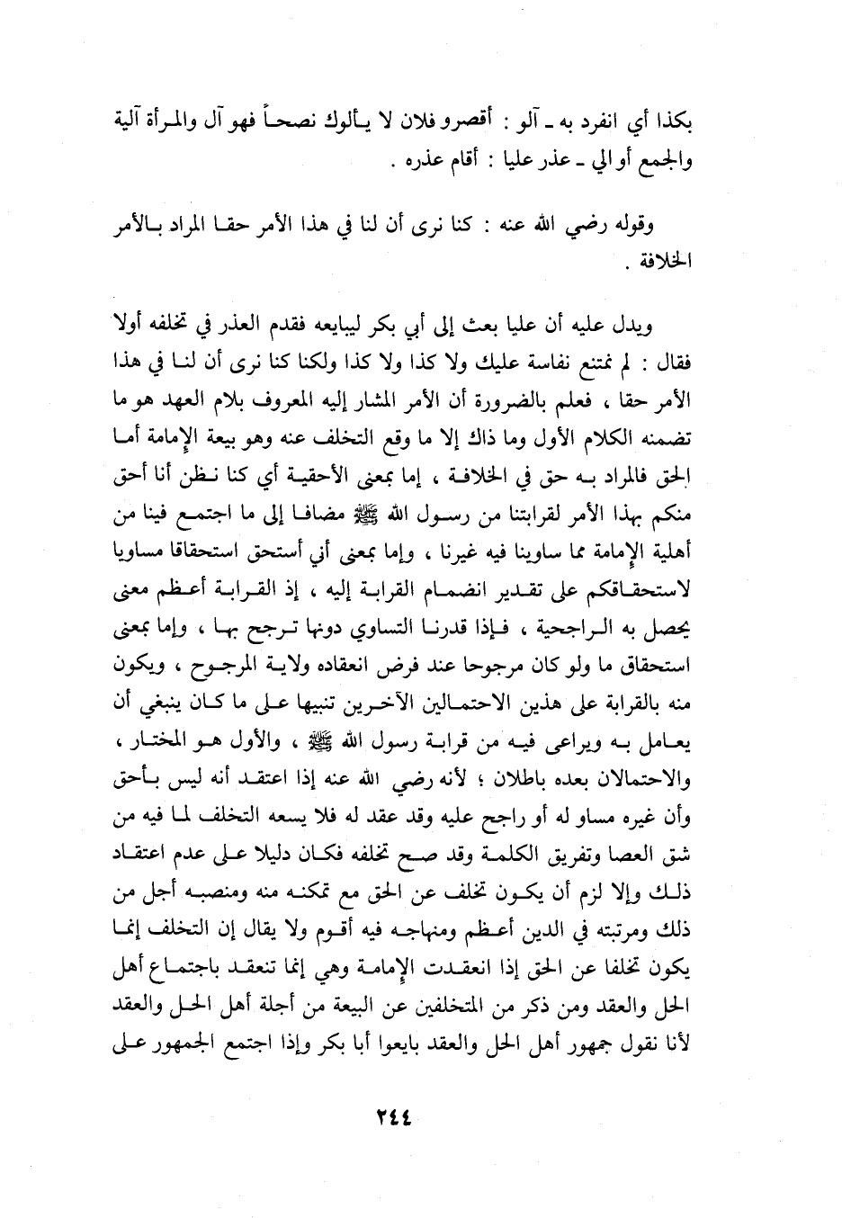 ويدل عليه أن عليا بعث إلى أبي بكر ليبايعه, فقدم العذر في تخلفه أولًا فقال: لم نمتنع نفاسة عليك ولا كذا ولا كذا ولكنا كنا نرى أن لنا في هذا الأمر حقا, فعلم بالضرورة أن الأمر المشار إليه المعرف بلام العهد هو ما تضمنه الكلام الأول وما ذاك إلا ما وقع التخلف عنه وهو بيعة الإمامة, أما الحق فالمراد به حق في الخلافة, إما بمعنى الأحقية أي: كنا نظن أنا أحق منكم بهذا الأمر لقرابتنا من رسول الله -صلى الله عليه وسلم- مضافًا إلى ما اجتمع فينا من أهلية الإمامة مما ساوينا فيه غيرنا, وإما بمعنى أني أستحق استحقاقًا مساويًا لاستحقاقكم على تقدير انضمام القرابة إليه؛ إذ القرابة أعظم معنى يحصل به الراجحية, فإذا قدرنا التساوي دونها ترجح بها, وإما بمعنى استحقاق ما ولو كان مرجوحًا عند فرض انعقاده ولاية المرجوح, ويكون منه بالقرابة على هذين الاحتمالين الآخرين تنبيهًا على ما كان ينبغي أن يعامل به ويراعى فيه من قرابة رسول الله -صلى الله عليه وسلم- والأول هو المختار, والاحتمالان بعده باطلان؛ لأنه -رضي الله عنه- إذا اعتقد أنه ليس بأحق وأن غيره مساو له أو راجح عليه وقد عقد له, فلا يسعه التخلف لما فيه من شق العصا وتفريق الكلمة وقد صح تخلفه, فكان دليلًا على عدم اعتقاد ذلك وإلا لزم أن يكون تخلف عن الحق مع تمكنه منه ومنصبه أجل من ذلك ومرتبته في الدين أعظم ومنهاجه فيه أقوم, ولا يقال: إن التخلف إنما يكون تخلفًا عن الحق إذا انعقدت الإمامة وهي إنما تنعقد بإجماع أهل الحل والعقد, ومن ذكر من المتخلفين عن البيعة من أجلة أهل الحل والعقد؛ لأنا نقول: جمهور أهل الحل والعقد بايعوا أبا بكر وإذا اجتمع الجمهور على