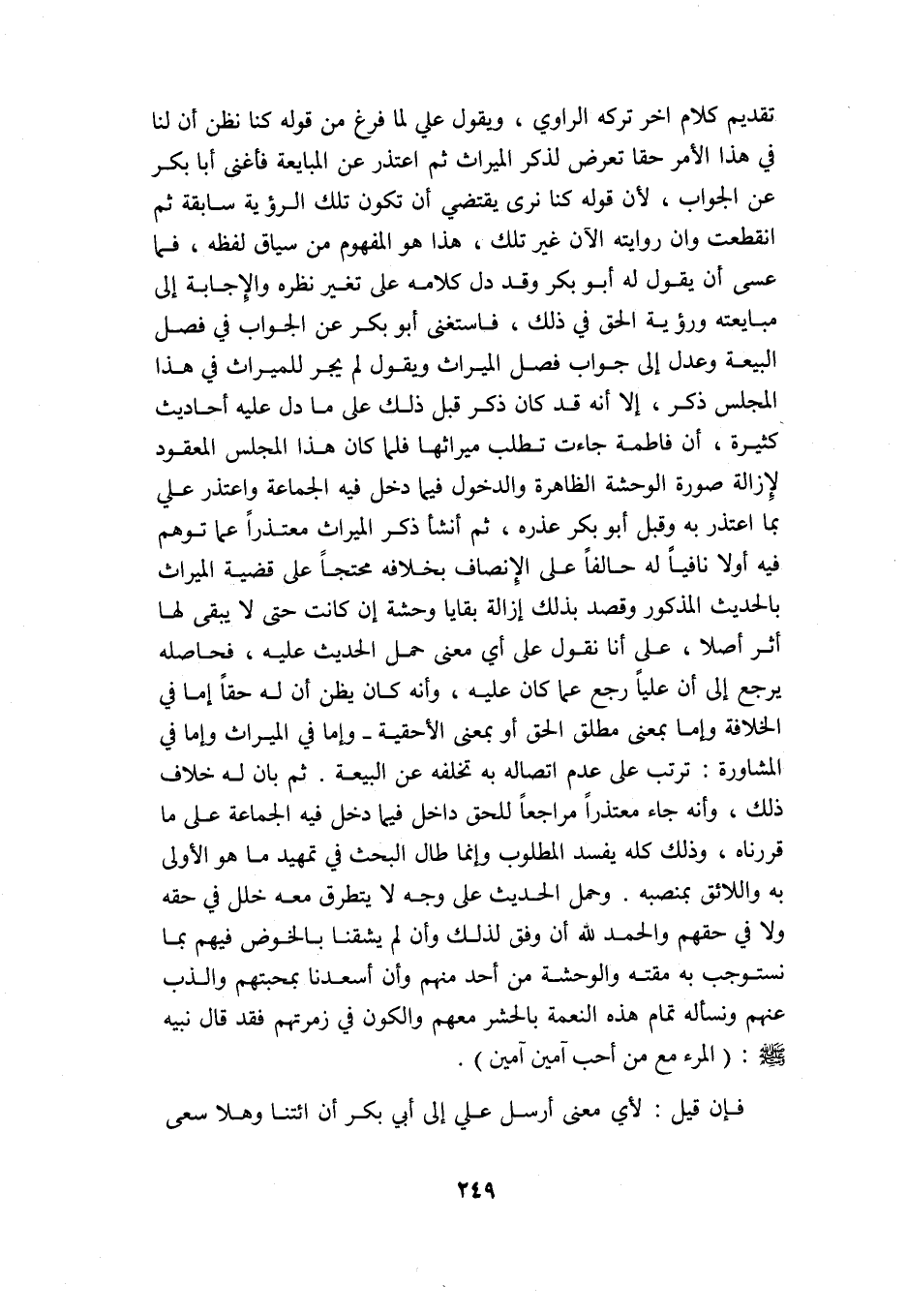 تقديم كلام آخر تركه الراوي, ويكون علي لما فرغ من قوله: كنا نظن أن لنا في هذا الأمر حقا تعرض لذكر الميراث ثم اعتذر عن المبايعة فأغنى أبا بكر عن الجواب؛ لأن قوله: كنا نرى يقتضي أن تكون تلك الرؤية سابقة ثم انقطعت وإن روايته الآن غير تلك, هذا هو المفهوم من سياق لفظه, فما عسى أن يقول له أبو بكر وقد دل كلامه على تغير نظره والإجابة إلى مبايعته ورؤية الحق في ذلك, فاستغنى أبو بكر عن الجواب في فصل البيعة وعدل إلى جواب فصل الميراث, أو يقول: لم يجر للميراث في هذا المجلس ذكر, إلا أنه قد كان ذكر قبل ذلك على ما دل عليه أحاديث كثيرة, أن فاطمة جاءت تطلب ميراثها فلما كان هذا المجلس المعقود لإزالة صورة الوحشة الظاهرة والدخول فيما دخل فيه الجماعة واعتذر علي بما اعتذر به, وقبل أبو بكر عذره ثم أنشأ ذكر الميراث معتذرًا عما توهم فيه أولًا نافيًا له حالفًا على الإنصاف بخلافه محتجًّا على قضية الميراث بالحديث المذكور وقصد بذلك إزالة بقايا وحشة إن كانت حتى لا يبقى لها أثر أصلًا, على أنا نقول: على أي معنى حمل الحديث عليه, فحاصله يرجع إلى أن عليا رجع عما كان عليه, وأنه كان يظن أن له حقا إما في الخلافة, وإما بمعنى مطلق الحق أو بمعنى الأحقية, وإما في الميراث, وإما في المشاورة, ترتب على عدم اتصاله به تخلفه عن البيعة, ثم بان له خلاف ذلك وأنه جاء معتذرًا مراجعًا للحق داخلًا فيما دخل فيه الجماعة على ما قررناه, وذلك كله يفسد المطلوب وإنما طال البحث في تمهيد ما هو الأولى به واللائق بمنصبه. وحمل الحديث على وجه لا يتطرق معه خلل في حقه ولا في حقهم والحمد لله أن وفق لذلك, وأن لم يشقنا بالخوض فيهم بما نستوجب به مقته والوحشة من أحد منهم, وأن أسعدنا بمحبتهم والذب عنهم, ونسأله تمام هذه النعمة بالحشر معهم والكون في زمرتهم فقد قال نبينا -صلى الله عليه وسلم: "المرء مع من أحب" آمين آمين.