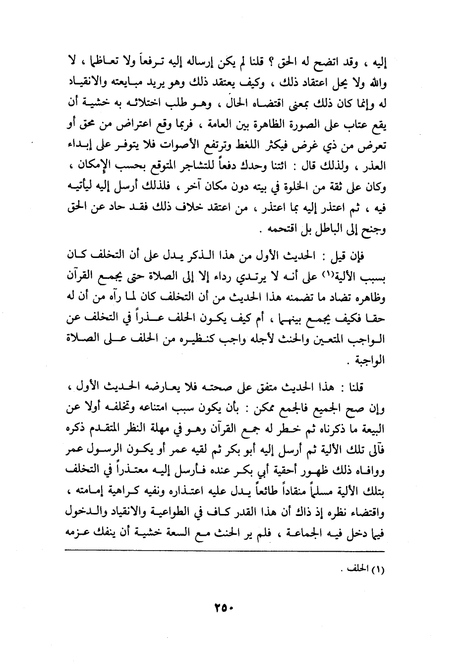قلنا: هذا الحديث متفق على صحته فلا يعارضه الحديث الأول, وإن صح الجميع فالجمع ممكن بأن يكون سبب امتناعه وتخلفه أولًا عن البيعة ما ذكرناه, ثم خطر له جمع القرآن وهو في مهلة النظر المتقدم ذكره, فآلى تلك الألية ثم أرسل إليه أبو بكر ثم لقيه عمر أو يكون الرسول عمر ووافاه ذلك ظهور أحقية أبي بكر عنده فأرسل إليه معتذرًا في التخلف بتلك الألية مسلمًا منقادًا طائعًا يدل عليه اعتذاره ونفيه كراهية إمامته, واقتضاء نظره إذ ذاك أن هذا القدر كافٍ في الطواعية والانقياد والدخول فيما دخل فيه الجماعة, فلم ير الحنث مع السعة خشية أن ينفك عزمه