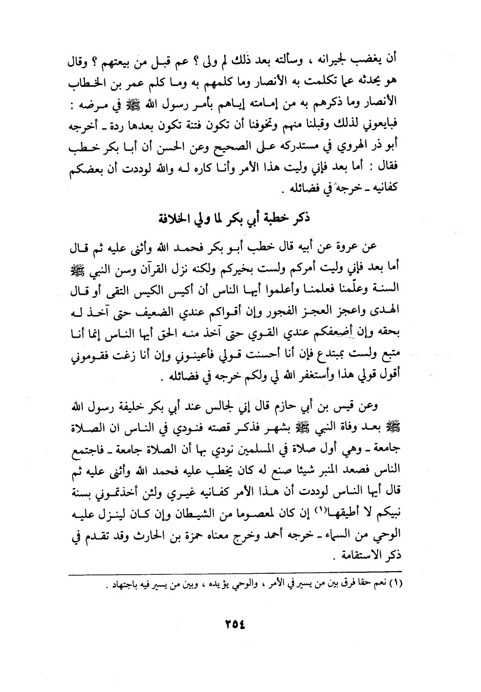 وعن قيس بن أبي حازم قال: إني جالس عند أبي بكر خليفة رسول الله -صلى الله عليه وسلم- بعد وفاة النبي -صلى الله عليه وسلم- بشهر فذكر قصته, فنودي في الناس: إن الصلاة جامعة -وهي أول صلاة في المسلمين نودي بها: إن الصلاة جامعة- فاجتمع الناس فصعد المنبر شيئًا صنع له كان يخطب عليه, فحمد الله وأثنى عليه ثم قال: أيها الناس لوددت أن هذا الأمر كفانيه غيري, ولئن أخذتموني بسنة نبيكم لا أطيقها1 إن كان لمعصومًا من الشيطان, وإن كان لينزل عليه الوحي من السماء. خرجه أحمد وخرج معناه حمزة بن الحارث, وقد تقدم في ذكر الاستقالة.