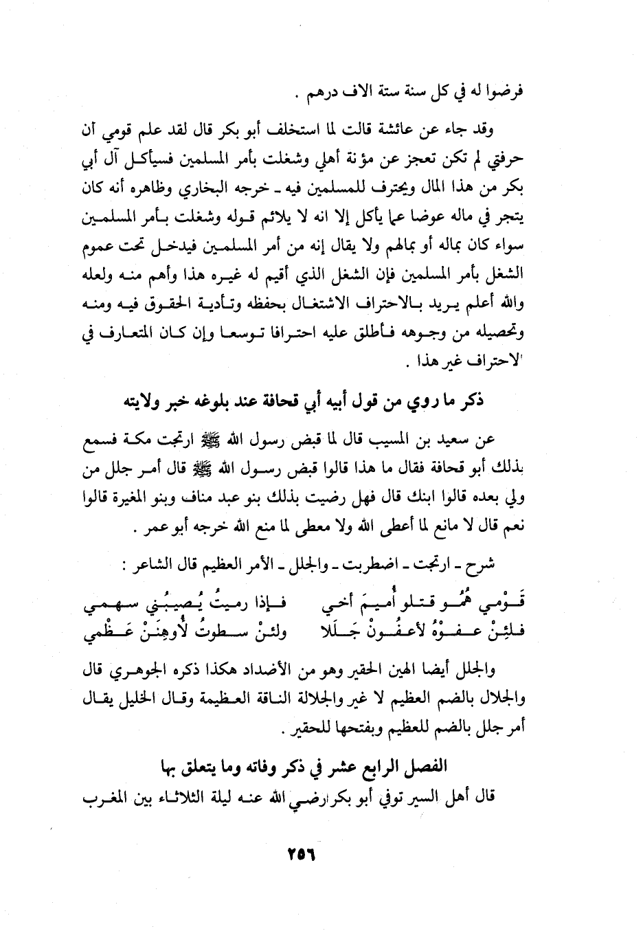 وقد جاء عن عائشة قالت: لما استخلف أبو بكر قال: لقد علم قومي أن حرفتي لم تكن تعجز عن مؤنة أهلي, وشغلت بأمر المسلمين فسيأكل آل أبي بكر من هذا المال, ويحترف للمسلمين فيه. خرجه البخاري وظاهره يدل على أنه كان يتجر في ماله عوضًا عما يأكل, إلا أنه لا يلائم قوله: وشغلت بأمر المسلمين سواء كان بماله أو بمالهم ولا يقال: إنه من أمر المسلمين فيدخل تحت عموم الشغل بأمر المسلمين, فإن الشغل الذي أقيم له غيره هذا وأهم منه, ولعله والله أعلم يريد بالاحتراف الاشتغال بحفظه وتأدية الحقوق فيه ومنه, وتحصيله من وجوهه, فأطلق عليه احترافًا توسعًا وإن كان المتعارف في الاحتراف غير هذا.