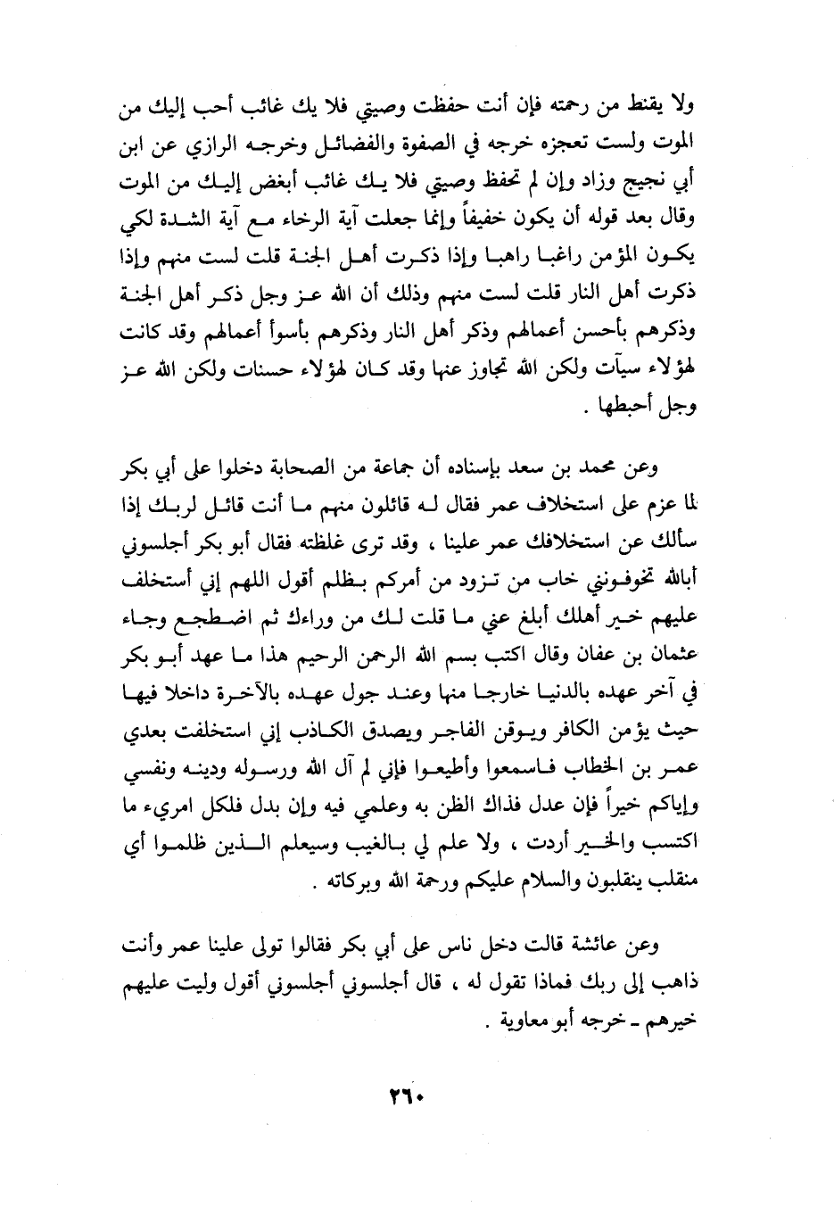 وعن محمد بن سعد بإسناده أن جماعة من الصحابة دخلوا على أبي بكر لما عزم على استخلاف عمر فقال له قائلون منهم: ما أنت قائل لربك إذا سألك عن استخلافك عمر علينا, وقد ترى غلظته؟ فقال أبو بكر: أجلسوني, أبالله تخوفونني خاب من تزود من أمركم بظلم, أقول: اللهم إني استخلفت عليهم خير أهلك, أبلغ عني ما قلت لك من وراءك, ثم اضطجع وجاء عثمان بن عفان وقال: اكتب: بسم الله الرحمن الرحيم هذا ما عهد أبو بكر في آخر عهده بالدنيا خارجًا منها وعند أول عهده بالآخرة داخلًا فيها, حيث يؤمن الكافر ويوقن الفاجر ويصدق الكاذب: إني استخلفت بعدي عمر بن الخطاب, فاسمعوا وأطيعوا فإني لم آل الله ورسوله ودينه ونفسي وإياكم إلا خيرًا, فإن عدل فذاك الظن به وعلمي فيه, وإن بدل فلكل امرئ ما اكتسب والخير أردت, ولا علم لي بالغيب {وَسَيَعْلَمُ الَّذِينَ ظَلَمُوا أَيَّ مُنْقَلَبٍ يَنْقَلِبُونَ} والسلام عليكم ورحمة الله وبركاته.