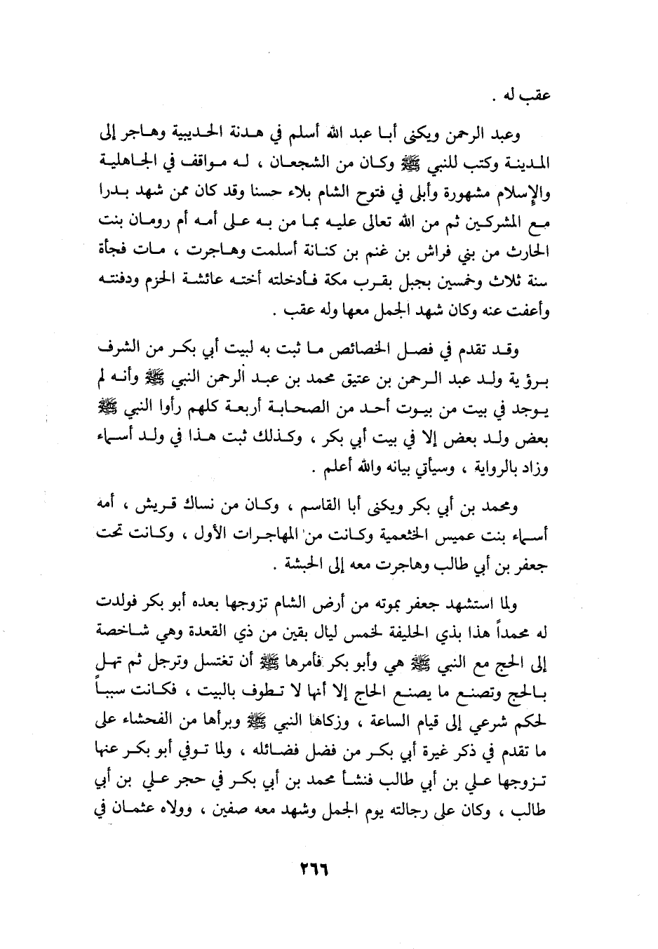 وقد تقدم في فصل الخصائص ما ثبت به لبيت أبي بكر من الشرف, برؤية ولد عبد الرحمن بن عتيق محمد بن عبد الرحمن النبي -صلى الله عليه وسلم- وأنه لم يوجد في بيت من بيوت أحد من الصحابة أربعة كلهم رأوا النبي -صلى الله عليه وسلم- بعضهم ولد بعض إلا في بيت أبي بكر, وكذلك ثبت هذا في ولد أسماء وزاد بالرواية وسيأتي بيانه والله أعلم.