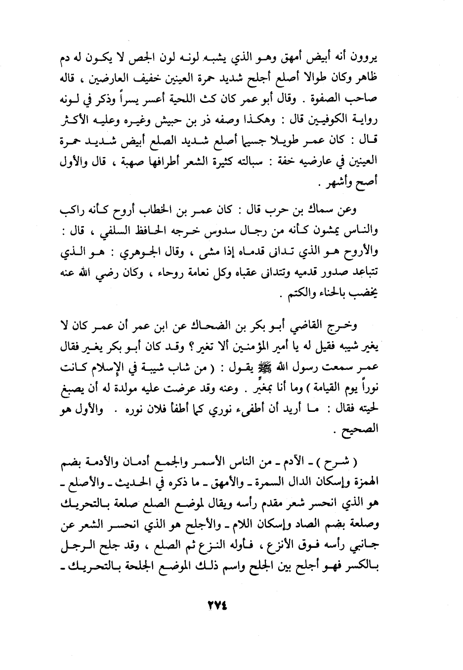 وعن سماك بن حرب قال: كان عمر بن الخطاب أروح كأنه راكب والناس يمشون كأنه من رجال سدوس, خرجه الحافظ السلفي, قال: والأروح: هو الذي تدانى قدماه إذا مشى، وقال الجوهري: هو الذي تتباعد صدور قدميه وتتدانى عقباه وكل نعامة روحاء، وكان رضي الله عنه يخضب بالحناء والكتم.