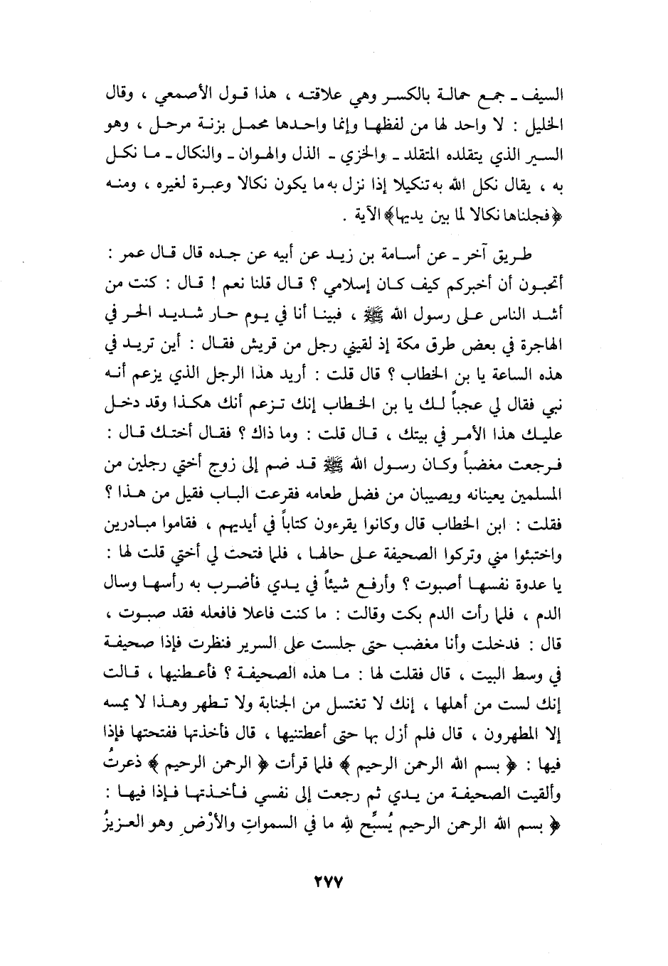 طريق آخر, عن أسامة بن زيد عن أبيه عن جده قال: قال عمر: أتحبون أن أخبركم كيف كان إسلامي? قال: قلنا نعم! قال: كنت من أشد الناس على رسول الله -صلى الله عليه وسلم- فبينا أنا في يوم حار شديد الحر في الهاجرة في بعض طرق مكة إذ لقيني رجل من قريش فقال: أين تريد في هذه الساعة يابن الخطاب? قال: قلت: أريد هذا الرجل الذي يزعم أنه نبي, فقال لي: عجبًا لك يابن الخطاب, إنك تزعم أنك هكذا وقد دخل عليك هذا الأمر في بيتك! قال: قلت: وما ذاك? فقال: أختك قال: فرجعت مغضبًا وكان رسول الله -صلى الله عليه وسلم- قد ضم إلى زوج أختي رجلين من المسلمين يعينانه ويصيبان من فضل طعامه, فقرعت الباب فقيل: من هذا? فقلت: ابن الخطاب قال: وكانوا يقرءون كتابًا في أيديهم، فقاموا مبادرين واختبئوا مني وتركوا الصحيفة على حالها، فلما فتحت لي أختي قلت لها: يا عدوة نفسها أصبوت? وأرفع شيئًا في يدي فأضرب به رأسها وسال الدم، فلما رأت الدم بكت وقالت: ما كنت فاعلًا فافعله فقد صبوت، قال: فدخلت وأنا مغضب حتى جلست على السرير فنظرت فإذا صحيفة في وسط البيت، قال: فقلت لها: ما هذه الصحيفة؟ فأعطنيها، قالت: إنك لست من أهلها، إنك لا تغتسل من الجنابة ولا تطهر وهذا لا يمسه إلا المطهرون، قال: فلم أزل بها حتى أعطتنيها، قال: فأخذتها ففتحتها فإذا فيها: {بِسْمِ اللَّهِ الرَّحْمَنِ الرَّحِيمِ} فلما قرأت: {الرَّحْمَنِ الرَّحِيمِ} ذعرت وألقيت الصحيفة من يدي ثم رجعت إلى نفسي فأخذتها, فإذا فيها: {بِسْمِ اللَّهِ الرَّحْمَنِ الرَّحِيمِ سَبَّحَ لِلَّهِ مَا فِي السَّمَاوَاتِ وَالْأَرْضِ وَهُوَ الْعَزِيزُ