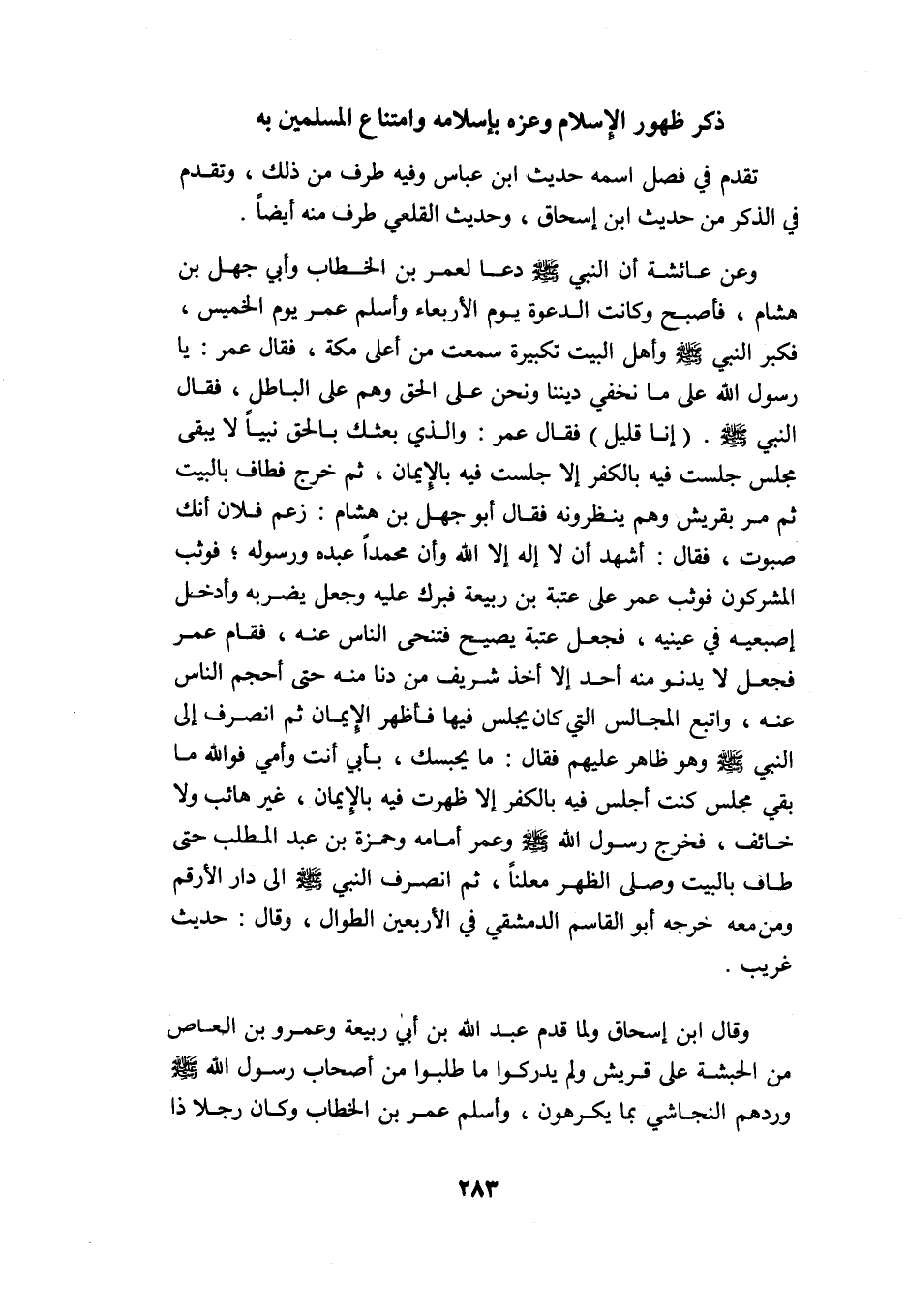 وقال ابن إسحاق: ولما قدم عبد الله بن أبي ربيعة وعمرو بن العاص من الحبشة على قريش ولم يدركوا ما طلبوا من أصحاب رسول الله -صلى الله عليه وسلم- وردهم النجاشي بما يكرهون، وأسلم عمر بن الخطاب وكان رجلًا ذا