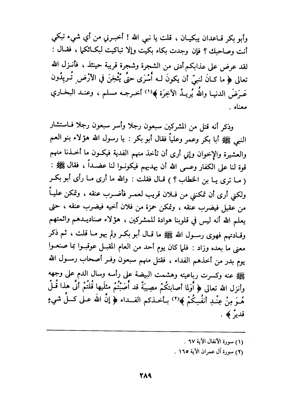 وأبو بكر قاعدان يبكيان، قلت: يا نبي الله أخبرني من أي شيء تبكي أنت وصاحبك? فإن وجدت بكاء بكيت وإلا تباكيت لبكائكما، فقال: "لقد عرض علي عذابكم أدنى من الشجرة وشجرة قريبة حينئذ، فأنزل الله تعالى: {مَا كَانَ لِنَبِيٍّ أَنْ يَكُونَ لَهُ أَسْرَى حَتَّى يُثْخِنَ فِي الْأَرْضِ تُرِيدُونَ عَرَضَ الدُّنْيَا وَاللَّهُ يُرِيدُ الْآخِرَة} " 1 أخرجه مسلم، وعند البخاري معناه.
