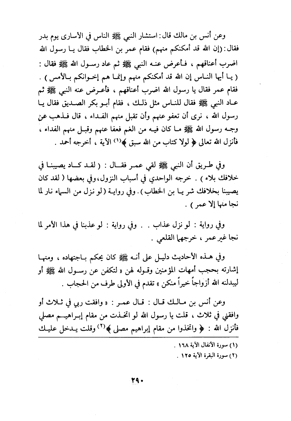 وعن أنس بن مالك قال: قال عمر: "وافقت ربي في ثلاث أو وافقني في ثلاث: قلت: يا رسول الله لو اتخذت من مقام إبراهيم مصلى؟ فأنزل الله: {وَاتَّخِذُوا مِنْ مَقَامِ إِبْرَاهِيمَ مُصَلًّى} 2 وقلت: يدخل عليك