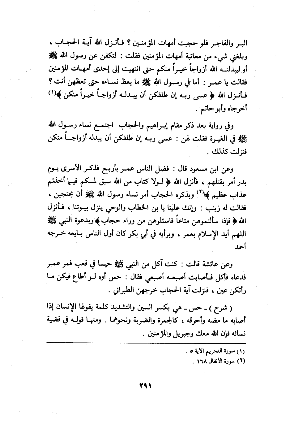 البر والفاجر, فلو حجبت أمهات المؤمنين? فأنزل الله آية الحجاب، وبلغني شيء من معاتبة أمهات المؤمنين فقلت: لتكفن عن رسول الله -صلى الله عليه وسلم- أو ليبدلنه الله أزواجًا خيرًا منكن, حتى انتهيت إلى إحدى أمهات المؤمنين فقالت: يا عمر أما في رسول الله -صلى الله عليه وسلم- ما يعظ نساءه حتى تعظهن أنت? فأنزل الله: {عَسَى رَبُّهُ إِنْ طَلَّقَكُنَّ أَنْ يُبْدِلَهُ أَزْوَاجًا خَيْرًا مِنْكُنَّ} 1 أخرجاه وأبو حاتم.