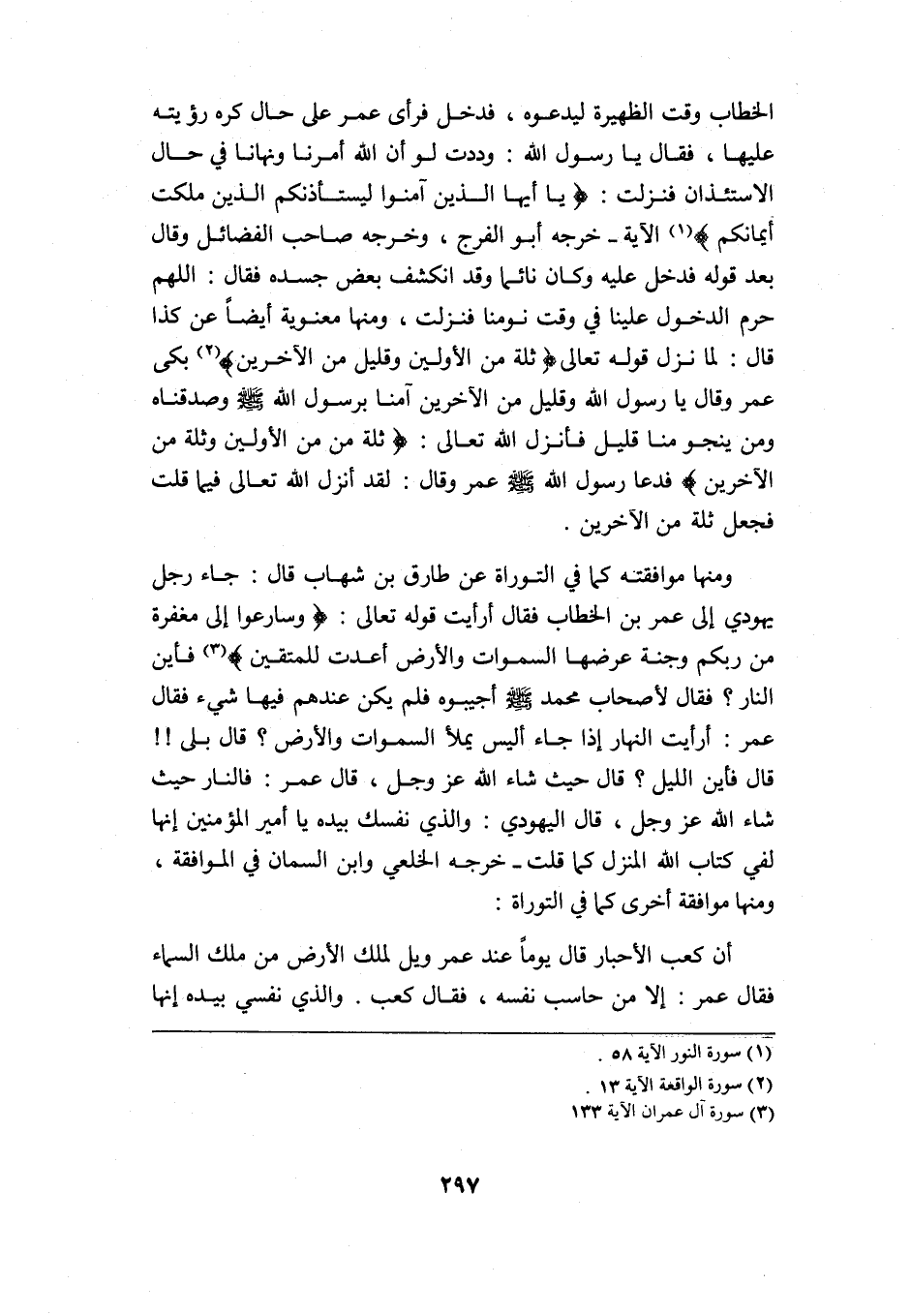 ومنها موافقته كما في التوراة عن طارق بن شهاب قال: جاء رجل يهودي إلى عمر بن الخطاب فقال: أرأيت قوله تعالى: {وَسَارِعُوا إِلَى مَغْفِرَةٍ مِنْ رَبِّكُمْ وَجَنَّةٍ عَرْضُهَا السَّمَاوَاتُ وَالْأَرْضُ أُعِدَّتْ لِلْمُتَّقِينَ} 3, فأين النار? فقال: لأصحاب محمد -صلى الله عليه وسلم- أجيبوه فلم يكن عندهم فيها شيء فقال عمر: أرأيت النهار إذا جاء أليس يملأ السموات والأرض? قال: بلى قال: فأين الليل? قال: حيث شاء الله -عز وجل- قال عمر: فالنار حيث شاء الله -عز وجل- قال اليهودي: والذي نفسك بيده يا أمير المؤمنين, إنها لفي كتاب الله المنزل كما قلت, خرجه الخلعي وابن السمان في الموافقة، ومنها موافقة أخرى كما في التوراة: