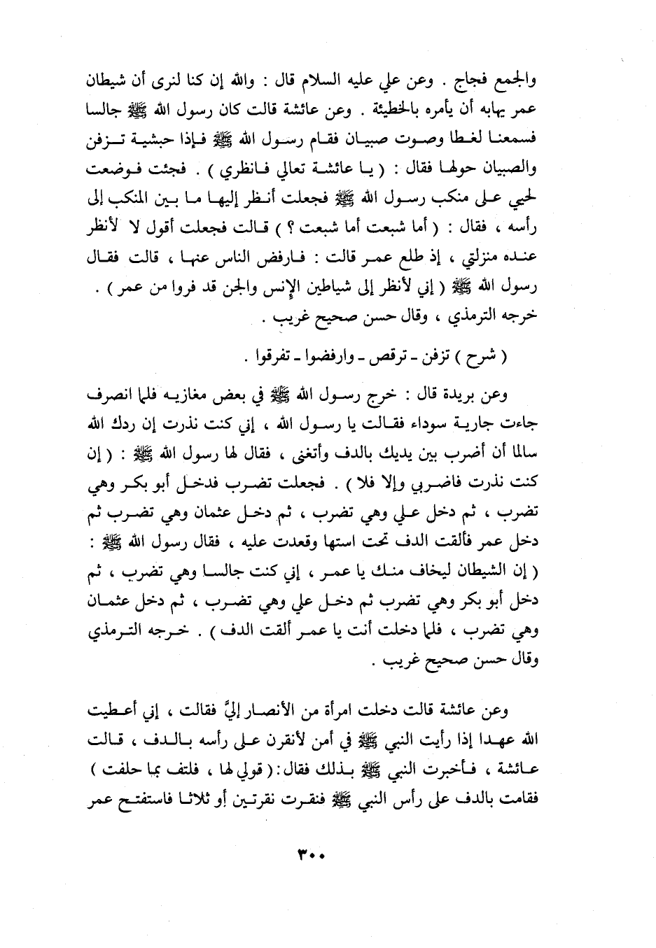 وعن بريدة قال: خرج رسول الله -صلى الله عليه وسلم- في بعض مغازيه, فلما انصرف جاءت جارية سوداء فقالت: يا رسول الله، إني كنت نذرت إن ردك الله سالمًا أن أضرب بين يديك بالدف وأتغنى، فقال لها رسول الله -صلى الله عليه وسلم: "إن كنت نذرت فاضربي, وإلا فلا" فجعلت تضرب فدخل أبو بكر وهي تضرب، ثم دخل علي وهي تضرب، ثم دخل عثمان وهي تضرب, ثم دخل عمر فألقت الدف تحت استها وقعدت عليه، فقال رسول الله -صلى الله عليه وسلم: "إن الشيطان ليخاف منك يا عمر، إني كنت جالسًا وهي تضرب، ثم دخل أبو بكر وهي تضرب، ثم دخل علي وهي تضرب، ثم دخل عثمان وهي تضرب، فلما دخلت أنت يا عمر ألقت الدف" خرجه الترمذي وقال: حسن صحيح غريب.