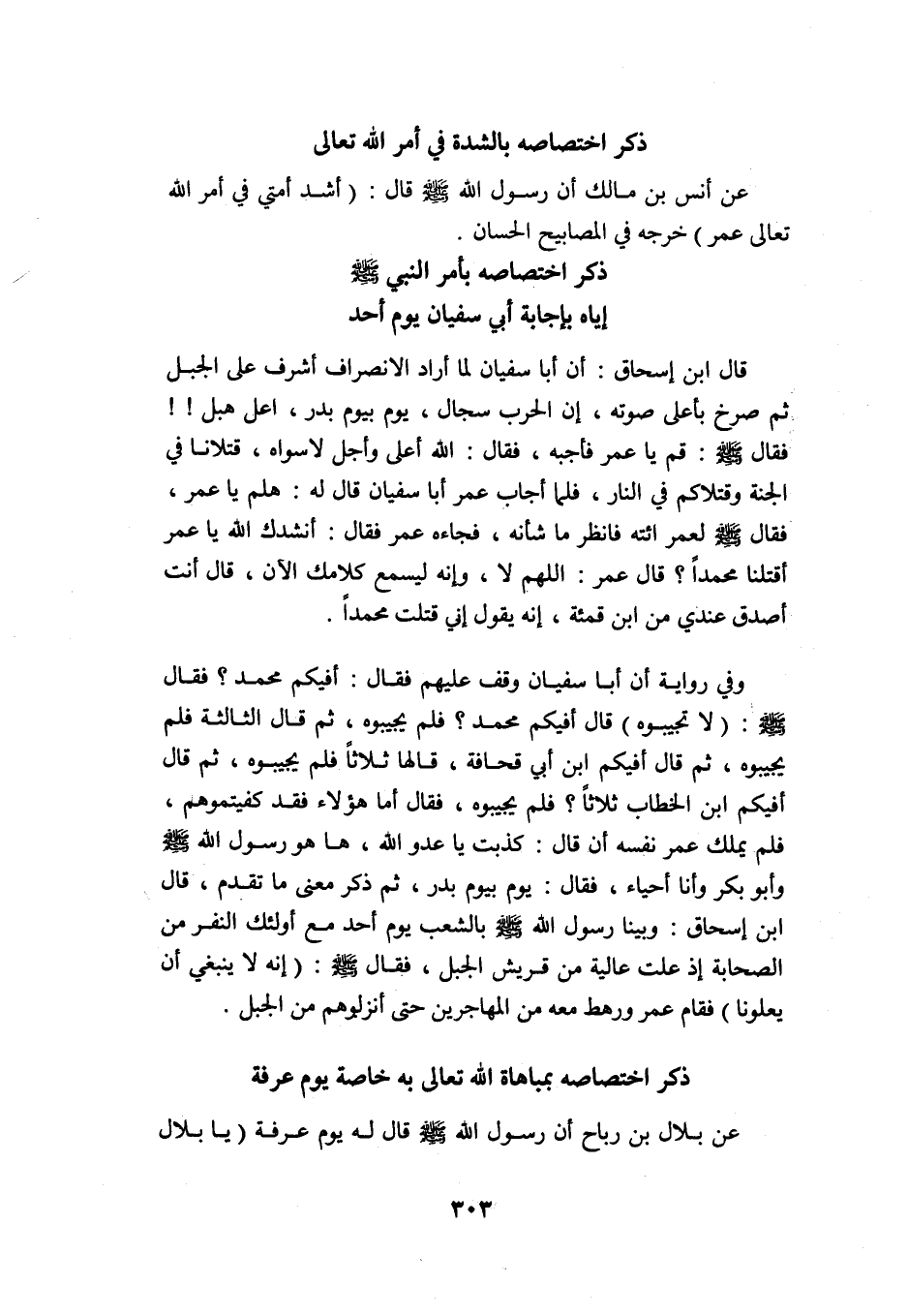 وفي رواية: أن أبا سفيان وقف عليهم فقال: أفيكم محمد? فقال صلى الله عليه وسلم: "لا تجيبوه" قال: أفيكم محمد? فلم يجيبوه، ثم قال الثالثة فلم يجيبوه، ثم قال: أفيكم ابن أبي قحافة؟ قالها ثلاثًا فلم يجيبوه، ثم قال: أفيكم ابن الخطاب ثلاثًا? فلم يجيبوه، فقال: أما هؤلاء فقد كفيتموهم، فلم يملك عمر نفسه أن قال: كذبت يا عدو الله، ها هو رسول الله -صلى الله عليه وسلم- وأبو بكر وإنا أحياء، فقال: يوم بيوم بدر، ثم ذكر معنى ما تقدم، قال ابن إسحاق: وبينا رسول الله -صلى الله عليه وسلم- بالشعب يوم أحد مع أولئك النفر من الصحابة إذ علت عالية من قريش الجبل، فقال صلى الله عليه وسلم: "إنه لا ينبغي أن يعلونا" فقام عمر ورهط معه من المهاجرين حتى أنزلوهم من الجبل.