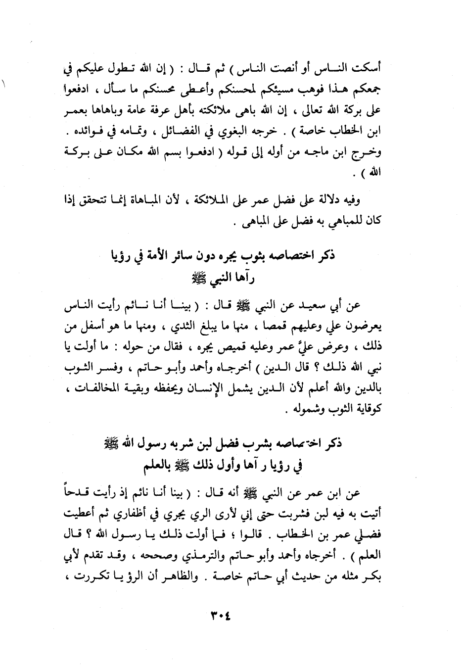 عن ابن عمر عن النبي -صلى الله عليه وسلم- أنه قال: "بينا أنا نائم, إذ رأيت قدحًا أتيت به فيه لبن, فشربت حتى إني لأرى الري يجري في أظفاري, ثم أعطيت فضلي عمر بن الخطاب" قالوا: فما أولت ذلك يا رسول الله? قال: "العلم" أخرجاه وأحمد وأبو حاتم والترمذي وصححه، وقد تقدم لأبي بكر مثله من حديث أبي حاتم خاصة. والظاهر أن الرؤيا تكررت،