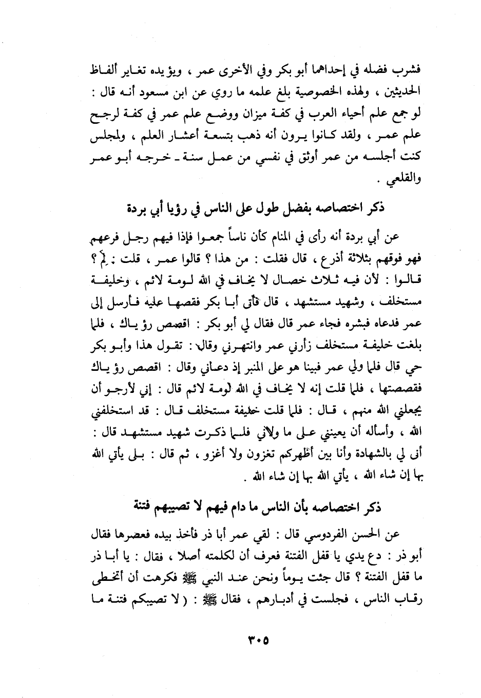 فشرب فضله في إحداهما أبو بكر وفي الأخرى عمر، ويؤيده تغاير ألفاظ الحديثين؛ ولهذه الخصوصية بلغ علمه ما روي عن ابن مسعود أنه قال: لو جمع علم أحياء العرب في كفة ميزان ووضع علم عمر في كفة, لرجح علم عمر، ولقد كانوا يرون أنه ذهب بتسعة أعشار العلم، ولمجلس كنت أجلسه من عمر أوثق في نفسي من عمل سنة. خرجه أبو عمر والقلعي.
