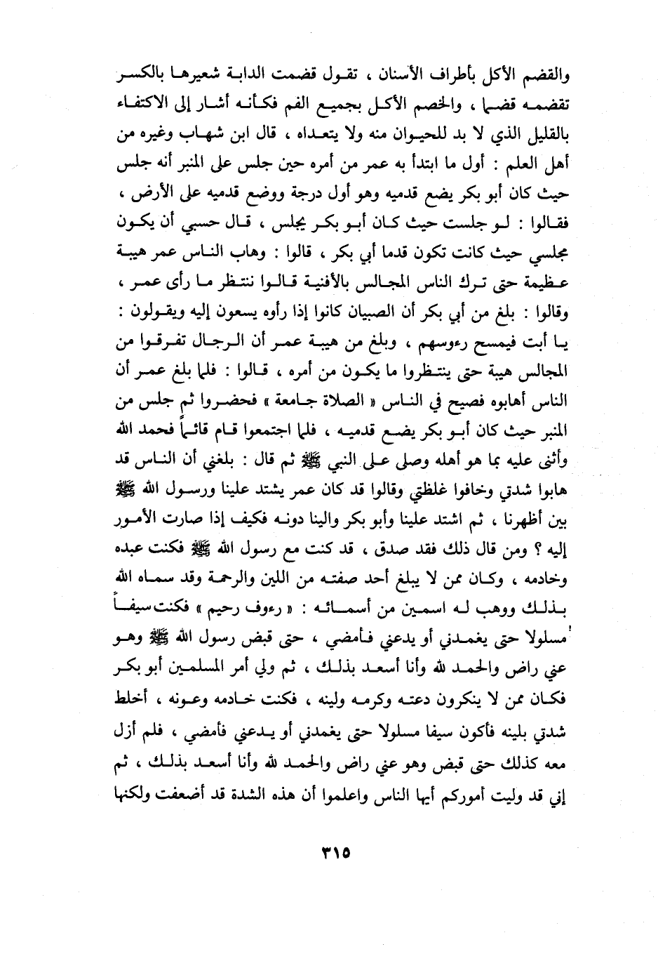 والقضم: الأكل بأطراف الأسنان، تقول: قضمت الدابة شعيرها بالكسر تقضمه قضمًا، والخصم: الأكل بجميع الفم, فكأنه أشار إلى الاكتفاء بالقليل الذي لا بد للحيوان منه ولا يتعداه، قال ابن شهاب وغيره من أهل العلم: أول ما ابتدأ به عمر من أمره حين جلس على المنبر أنه جلس حيث كان أبو بكر يضع قدميه وهو أول درجة ووضع قدميه على الأرض، فقالوا: لو جلست حيث كان أبو بكر يجلس، قال: حسبي أن يكون مجلسي حيث كانت تكون قدما أبي بكر، قالوا: وهاب الناس عمر هيبة عظيمة حتى ترك الناس المجالس بالأفنية قالوا: ننتظر ما رأى عمر، وقالوا: بلغ من أبي بكر أن الصبيان كانوا إذا رأوه يسعون إليه ويقولون: يا أبت فيمسح رءوسهم، وبلغ من هيبة عمر أن الرجال تفرقوا من المجالس هيبة حتى ينتظروا ما يكون من أمره، قالوا: فلما بلغ عمر أن الناس أهابوه فصيح في الناس: "الصلاة جامعة" فحضروا ثم جلس من المنبر حيث كان أبو بكر يضع قدميه، فلما اجتمعوا قام قائمًا فحمد الله وأثنى عليه بما هو أهله وصلى على النبي -صلى الله عليه وسلم- ثم قال: بلغني أن الناس قد هابوا شدتي وخافوا غلظتي وقالوا: قد كان عمر يشتد علينا ورسول الله -صلى الله عليه وسلم- بين أظهرنا، ثم اشتد علينا وأبو بكر والينا دونه, فكيف إذا صارت الأمور إليه? ومن قال ذلك فقد صدق، قد كنت مع رسول الله -صلى الله عليه وسلم- فكنت عبده وخادمه، وكان ممن لا يبلغ أحد صفته من اللين والرحمة وقد سماه الله بذلك, ووهب له اسمين من أسمائه: "رءوف رحيم" فكنت سيفًا مسلولًا حتى يغمدني أو يدعني فأمضي، حتى قبض رسول الله -صلى الله عليه وسلم- وهو عني راضٍ, والحمد لله وأنا أسعد بذلك، ثم ولي أمر المسلمين أبو بكر فكان ممن لا ينكرون دعته وكرمه ولينه، فكنت خادمه وعونه، أخلط شدتي بلينه فأكون سيفًا مسلولًا حتى يغمدني أو يدعني فأمضي، فلم أزل معه كذلك حتى قبض وهو عني راض, والحمد لله وأنا أسعد بذلك، ثم إني قد وليت أموركم أيها الناس, واعلموا أن هذه الشدة قد أضعفت ولكنها
