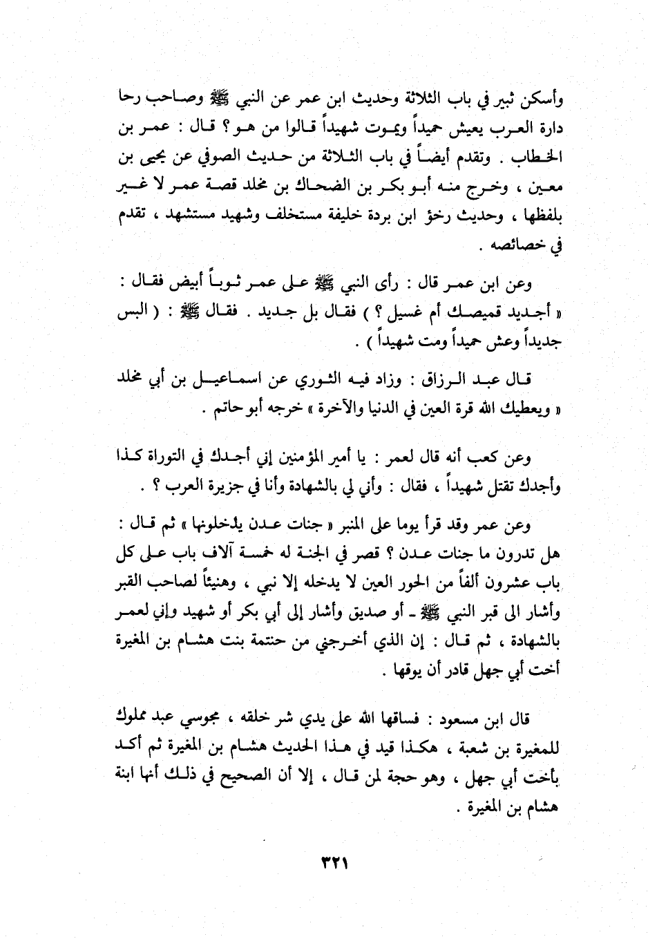 و "اسكن ثبير" في باب الثلاثة وحديث ابن عمر عن النبي -صلى الله عليه وسلم: "وصاحب رحى دارة العرب يعيش حميدًا ويموت شهيدًا" قالوا: من هو? قال: "عمر بن الخطاب". وتقدم أيضًا في باب الثلاثة من حديث الصوفي عن يحيى بن معين، وخرج منه أبو بكر بن الضحاك بن مخلد قصة عمر لا غير بلفظها، وحديث رخؤ بن بردة: "خليفة مستخلف, وشهيد مستشهد" تقدم في خصائصه.
